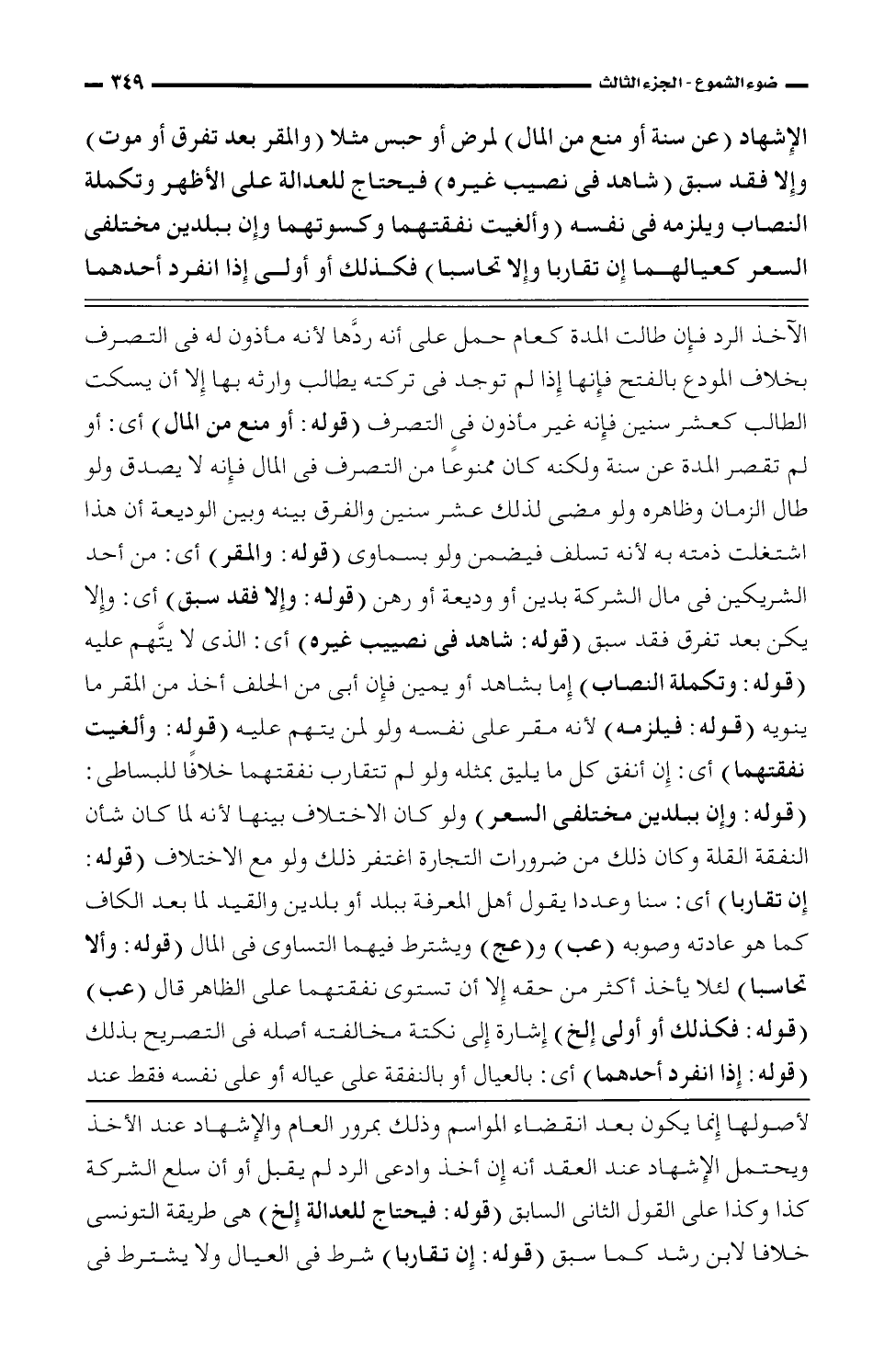 الآخذ الرد فإن طالت المدة كعام حمل على أنه ردَّها لأنه مأذون له فى التصرف بخلاف المودع بالفتح فإنها إذا لم توجد فى تركته يطالب وارثه بها إلا أن يسكت الطالب كعشر سنين فإنه غير مأذون فى التصرف (قوله: أو منع من المال) أى: أو لم تقصر المدة عن سنة ولكنه كان ممنوعًا من التصرف فى المال فإنه لا يصدق ولو طال الزمان وظاهره ولو مضى لذلك عشر سنين والفرق بينه وبين الوديعة أن هذا اشتغلت ذمته به لأنه تسلف فيضمن ولو بسماوى (قوله: والمقر) أى: من أحد الشريكين فى مال الشركة بدين أو وديعة أو رهن (قوله: وإلا فقد سبق) أى: وإلا يكن بعد تفرق فقد سبق (قوله: شاهد فى نصيب غيره) أى: الذى لا يتَّهم عليه (قوله: وتكملة النصاب) إما بشاهد أو يمين فإن أبى من الحلف أخذ من المقر ما ينويه (قوله: فيلزمه) لأنه مقر على نفسه ولو لمن يتهم عليه (قوله: وألغيت نفقتهما) أى: إن أنفق كل ما يليق بمثله ولو لم تتقارب نفقتهما خلافًا للبساطى: (قوله: وإن ببلدين مختلفى السعر) ولو كان الاختلاف بينها لأنه لما كان شأن النفقة القلة وكان ذلك من ضرورات التجارة اغتفر ذلك ولو مع الاختلاف (قوله: إن تقاربا) أى: سنا وعددا يقول أهل المعرفة ببلد أو بدلين والقيد لما بعد الكاف كما هو عادته وصوبه (عب) و (عج) ويشترط فيهما التساوى فى المال (قوله: وألا تحاسبا) لئلا يأخذ أكثر من حقه إلا أن تستوى نفقتهما على الظاهر قال (عب) (قوله: فكذلك أو أولى إلخ) إشارة إلى نكتة مخالفته أصله فى التصريح بذلك (قوله: إذا انفرد أحدهما) أى: بالعيال أو بالنفقة على عياله أو على نفسه فقط عند