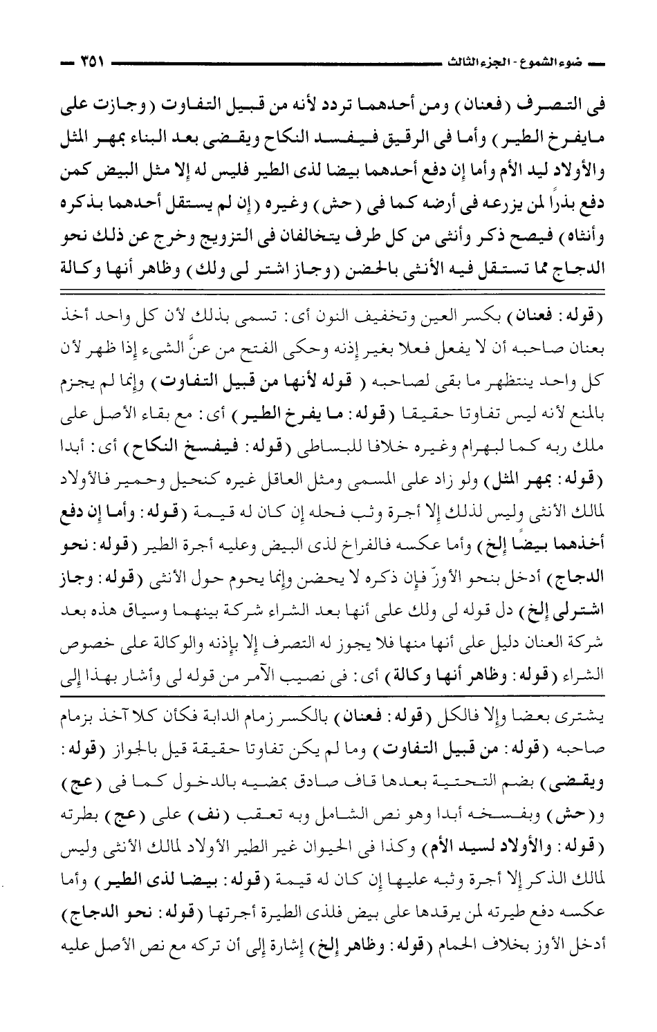 يشترى بعضا وإلا فالكل (قوله: فعنان) بالكسر زمام الدابة فكأن كلا آخذ بزمام صاحبه (قوله: من قبيل التفاوت) وما لم يكن تفاوتا حقيقة قيل بالجواز (قوله: ويقضى) بضم التحتية بعدها قاف صادق بمضيه بالدخول كما فى (عج) و (حش) وبفسخه أبدا وهو نص الشامل وبه تعقب (نف) على (عج) بطرته (قوله: والأولاد لسيد الأم) وكذا فى الحيوان غير الطير الأولاد لمالك الأنثى وليس لمالك الذكر إلا أجرة وثبه عليها إن كان له قيمة (قوله: بيضا لذى الطير) وأما عكسه دفع طيرته لمن يرقدها على بيض فلذى الطيرة أجرتها (قوله: نحو الدجاج) أدخل الأوز بخلاف الحمام (قوله: وظاهر إلخ) إشارة إلى أن تركه مع نص الأصل عليه