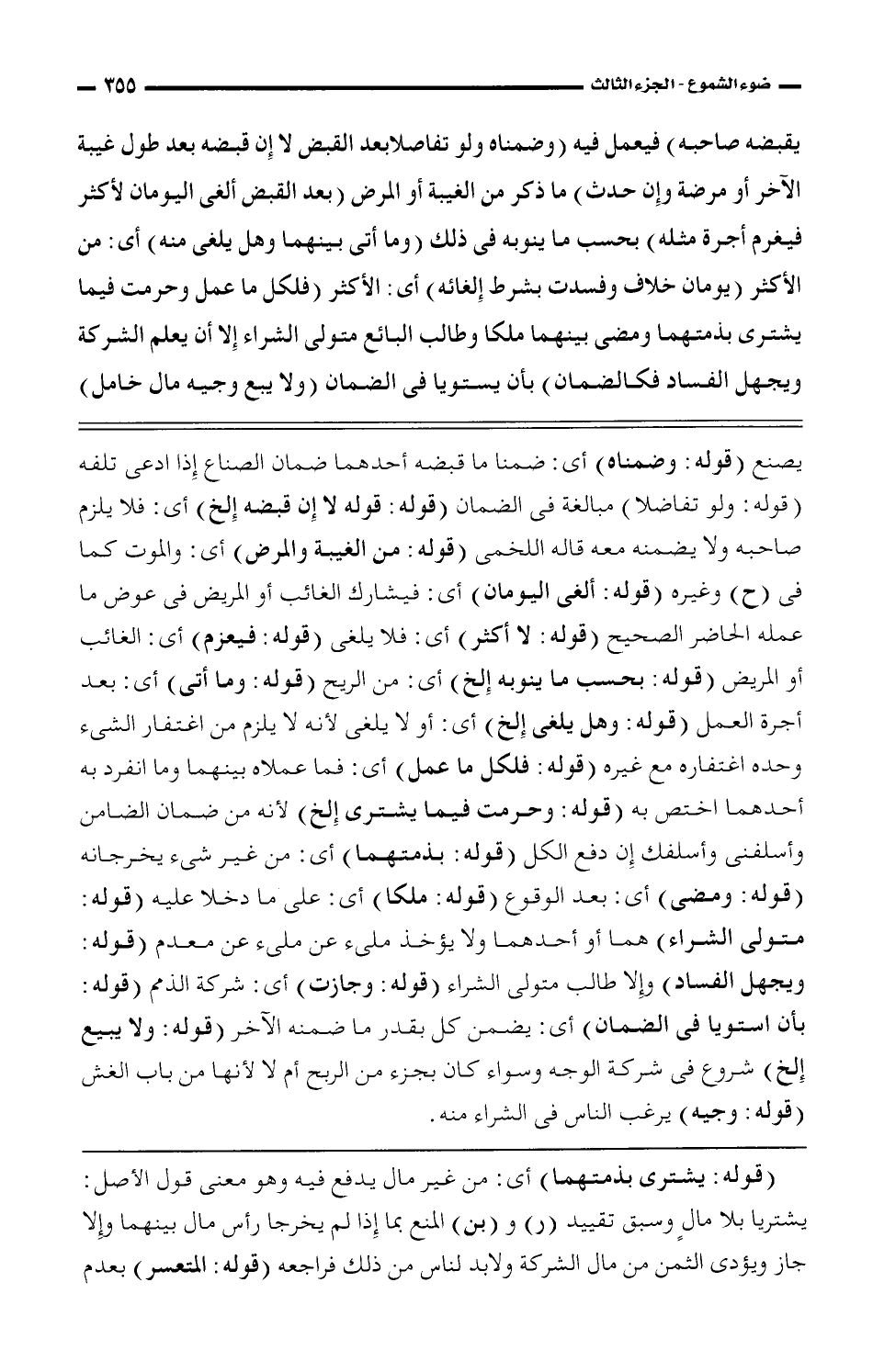 يصنع (قوله: وضمناه) أى: ضمنا ما قبضه أحدهما ضمان الصناع إذا ادعى تلفه (قوله: ولو تفاضلا) مبالغة فى الضمان (قوله: قوله لا إن قبضه إلخ) أى: فلا يلزم صاحبه ولا يضمنه معه قاله اللخمى (قوله: من الغيبة والمرض) أى: والموت كما فى (ح) وغيره (قوله: ألغى اليومان) أى: فيشارك الغائب أو المريض فى عوض ما عمله الحاضر الصحيح (قوله: لا أكثر) أى: فلا يلغى (قوله: فيعزم) أى: الغائب أو المريض (قوله: بحسب ما ينوبه إلخ) أى: من الريح (قوله: وما أتى) أى: بعد أجرة العمل (قوله: وهل يلغى إلخ) أى: أو لا يلغى لأنه لا يلزم من اغتفار الشئ وحده اغتفاره مع غيره (قوله: فلكل ما عمل) أى: فما عملان بينهما وما انفرد به أحدهما اختص به (قوله: وحرمت فيما يشترى إلخ) لأنه من ضمان الضامن وأسلفنى وأسلفك إن دفع الكل (قوله: بذمتهما) أى: من غير شئ يخرجانه (قوله: ومضى) أى: بعد الوقوع (قوله: ملكا) أى: على ما دخلا عليه (قوله: متولى الشراء) هما أن أحدهما ولا يؤخذ ملئ عن ملئ عن معدم (قوله: ويجهل الفساد) وإلا طلب متولى الشراء (قوله: وجازت) أى: شركة الذمم (قوله: ويجهل الفساد) وإلا طلب متولى الشراء (قوله: وجازت) أى: شركة الذمم (قوله: بأن استويا فى الضمان) أى: يضمن كل بقدر ما ضمنه الآخر (قوله: ولا يبيع إلخ) شروع فى شركة الوجه وسواء كان بجزء من الربح ام لا لأنها من باب الغش (قوله: وجيه) يرغب الناس فى الشراء منه.