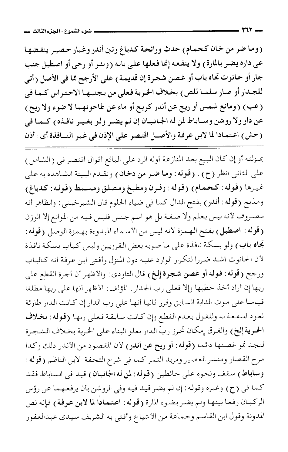 بمنزلته أو إن كان البيع بعد المنازعة أوله الرد على البائع أقول اقتصر فى (الشامل) على الثانى انظر (ح). (قوله: وما ضر من دخان) وتقدم البينة الشاهدة به على غيرها (قوله: كحمام) (قوله: وفرن ومطبخ ومصلق ومسمط (قوله: كدباغ) ومذبح (قوله: أندر) بفتح الدال كما فى ضياء الحلوم قال الشبرخيتى: والظاهر أنه مصروف لأنه ليس بعلم ولا صفة بل هو اسم جنس فليس فيه من الموانع إلا الوزن (قوله: اصطبل) بفتح الهمزة لأنه ليس من لأسماء المبدوءة بهمزة الوصل (قوله: تجاه باب) ولو بسكة نافذة على ما صوبه بعض القرويين وليس كباب بسكة نافذة لأن الحانوت أشد ضررا لتكرار الوارد عليه دون المنزل وأفتى ابن عرفة أنه كالباب ورجح (قوله: قوله أو غصن شجرة إلخ) قال التاودى: والأظهر أن أجرة القطع على ربها إن أراد أخذ حطبه وإلا فعلى رب الجدار. المؤلف: الأظهر أنها على ربها مطلقا قياسا على موت الدابة السابق وقرر ثانيا أنها على رب الدار إن كانت الدار طارئة لعود المنفعة له وللقول بعدم القطع وإن كانت سابقة فعلى ربها (قوله: بخلاف الحرية إلخ) والفرق إمكان تحرز ربٌ الدار بعلو البناء على الخربة بخلاف الشجرة لتجد نمو عصنها دائما (قوله: أو ريح عن أندر) لأن الملقصود من الأندر ذلك وكذا مرج القصار ومنشر العصير ومربد التمر كما فى شرح التحفة لابن الناظم (قوله: وساباط) سقف ونحوه على حائطين (قوله: لمن له الجانبان) قيد فى الساباط فقد كما فى (ح) وغيره وقوله: إن لم يضر قيد فيه وفى الروشن بأن يرفعهما عن رؤس الركبان رفعا بينها ولم يضر بضوء المارة (قوله: اعتمادًا لما لابن عرفة) فإنه نص المدونة وقول ابن القاسم وجماعة من الأشياخ وأفتى به الشريف سيدى عبد الغفور
