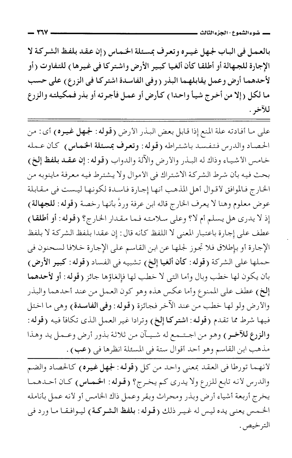 بالعمل فى الباب لجهل غيره وتعرف بمسئلة الخماس (إن عقد بلفظ الشركة لا الإجارة للجهالة أو أطلقا كأن ألغيا كبير الأرض واشتركا فى غيرها) للتفاوت (أو لأحدهما أرض وعمل يقابلهما البذر (وفى الفاسدة اشتركا فى الزرع) على حسب ما لكل (إلا من أخرج شيأ واحدا) كأرض أو عمل فأجرته أو بذر فمكيلته والزرع للآخر.