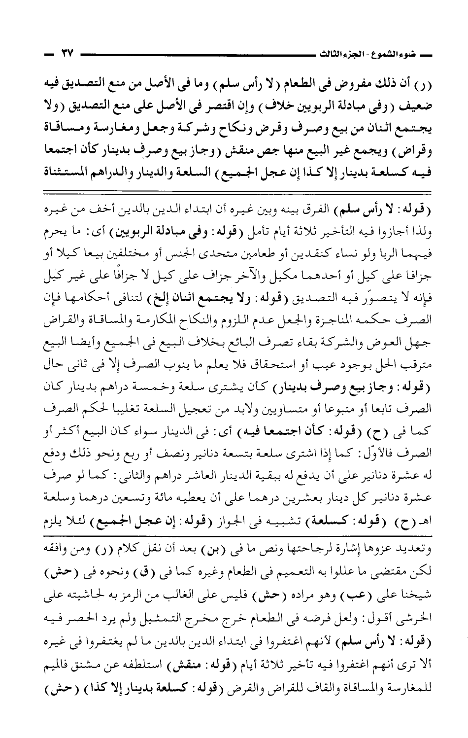 (ر) أن ذلك مفروض فى الطعام (لا رأس سلم) وما فى الأصل من منع التصديق فيه ضعيف (وفى مبادلة الربويين خلاف) وإن اقتصر فى الأصل على منع التصديق (ولا يجتمع اثنان من بيع وصرف وقرض ونكاح وشركة وجعل ومغارسة ومساقاة وقراض) ويجمع غير البيع منها جص منقش (وجاز بيع وصرف بدينار كأن اجتمعا فيه كسلعة بدينار إلا كذا إن عجل الجميع) السلعة والدينار والدراهم المستثناة