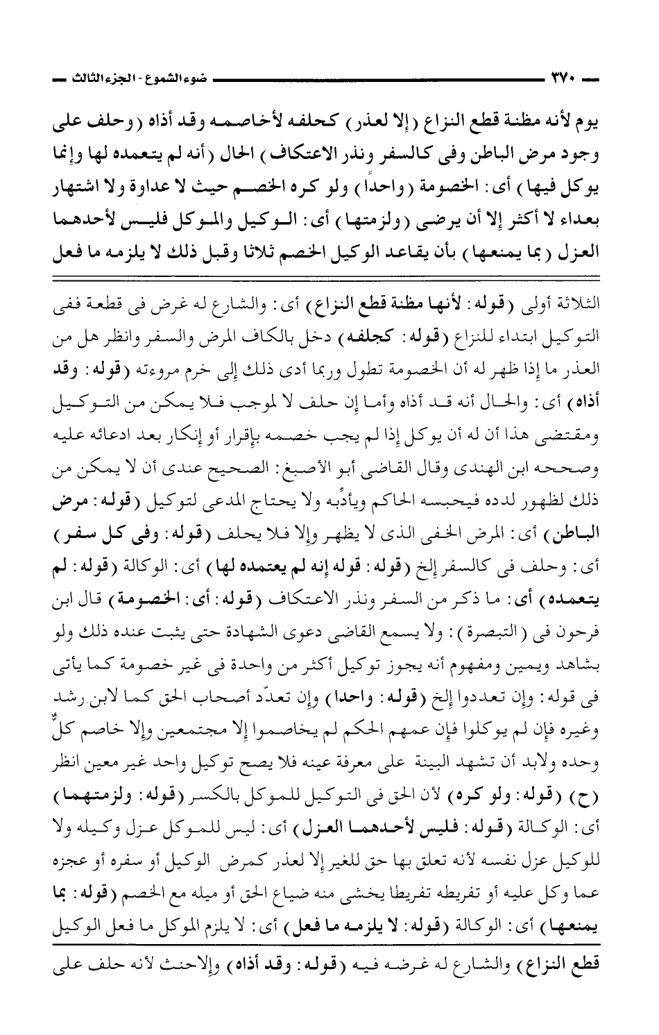 الثلاثة أولى (قوله: لأنها مظنة قطع النزاع) أى: والشارع له غرض فى قطعة ففى التوكيل ابتداء للنزاع (قوله: كجلفه) دخل بالكاف المرض والسفر وانظر هل من العذر ما إذا ظهر له أن الخصومة تطول وربما أدى ذلك إلى خرم مروءته (قوله: وقد أذاه) أى: والحال أنه قد أذاه وأما إن حلف لا لموجب فلا يمكن من التوكيل ومقتضى هذا أن له أن يوكل إذا لم يجب خصمه بإقرار أو إنكار بعد ادعائه عليه وصححه ابن الهندى وقال القاضى أبو الأصبغ: الصحيح عندى أن لا يمكن من ذلك لظهوره لدده فيحبسه الحاكمويأدَّبه ولا يحتاج المدعى لتوكيل (قوله: مرض الباطن) أى: المرض الخفى الذى لا يظهر وإلا فلا يحلف (قوله: وفى كل سفر) أى: وحلف فى كالسفر إلخ (قوله: قوله إنه لم يعتمده لها) أى: الوكالة (قوله: لم يتعمده) أى: ما ذكر من السفر ونذر الاعتكاف (قوله: أى: الخصومة) قال ابن فرحون فى (التبصرة): ولا يسمع القاضى دعوى الشهادة حتى يثبت عنده ذلك وبو بشاهد ويمين ومفهوم أنه يجوز توكيل أكثر من واحدة فى غير خصومة كما يأتى فى قوله: وإن تعددوا إلخ (قوله: واحدا) وإن تعدّد أصحاب الحق كما لابن رشد وغيره فإن لم يوكلوا فإن عمهم الحكم لم يخاصموا إلا مجتمعين وإلا خاصم كلٌّ وحده ولابد أن تشهد البينة على معرفة عينه فلا يصح توكيل واحد غير معين انظر (ح) (قوله: ولو كره) لأن الحق فى التوكيل للموكل بالكسر (قوله: ولزمتهما) أى: الوكالة (قوله: فبيس لأحدهما العزل) أى: ليس للموكل عزل وكيله ولا للوكيل عزل نفسه لأنه تعلق بها حق للغير إلا لعذر كمرص الوكيل أو سفره أو عجزه عما وكل عليه أو تفريطه تفريطا يخشى منه ضياع الحق أو ميله مع الخصم (قوله: بما يمنعها) أى: الوكالة (قوله: لا يلزمه ما فعل) أى: لا يلزم الموكل ما فعل الوكيل