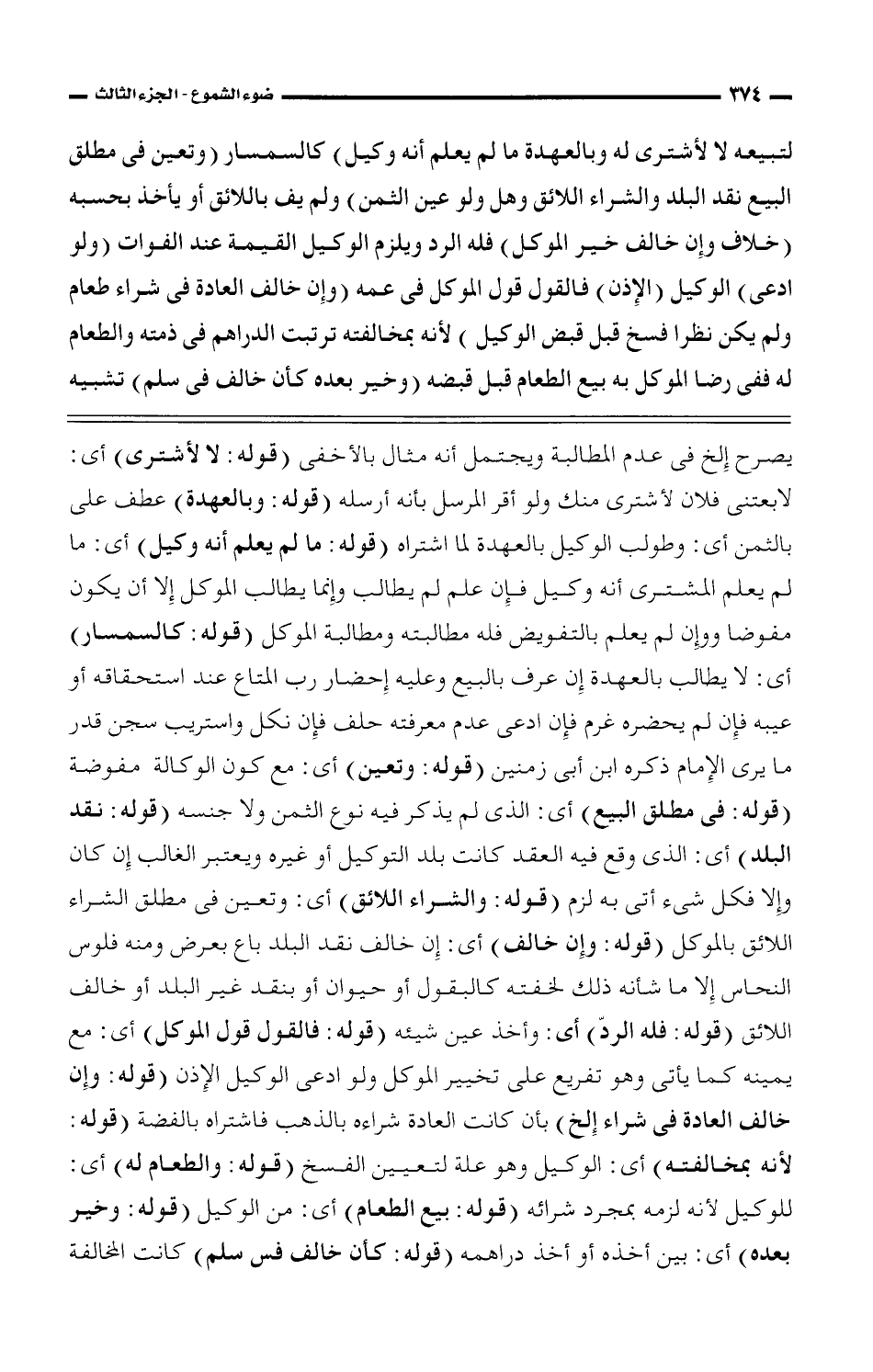 يصرح إلخ فى عدم المطالبة ويجتمل أنه مثال بالأخفى (قوله: لا لأشترى) أى: لا بعتنى فلان لأشترى منك ولو أقر المرسل بأنه أرسله (قوله: وبالعهدة) عطف على بالثمن أى: وطولب الوكيل بالعهدة لما اشتراه (قوله: ما لم يعلم أنه وكيل) أى: ما لم يعلم المشترى أنه وكيل فإن علم لم يطالب وإنما يطالب الموكل إلا أن يكون مفوضا وإن لم يعلم بالتفويض فله مطالبته ومطالبة الموكل (قوله: كالسمسار) أى: لا يطالب بالعهدة إن عرف بالبيع وعليه إحضار رب المتاع عند استحقاقه أو عيبه فإن لم يحضره غرم فإن ادعى عدم معرفته حلف فإن نكل واستريب سجن قدر ما يرى الإمام ذكره ابن أبى زمنين (قوله: وتعين) أى: مع كون الوكالة مفوضة (قوله: فى مطلق البيع) أى: الذى لم يذكر فيه نوع الثمن ولا جنسه (قوله: نقد البلد) أى: الذى وقع فيه العقد كانت بلد التوكيل أو غيره ويعتبر الغالب إن كان وإلا فكل شئ أتى به لزم (قوله: والشراء اللائق) أى: وتعين فى مطلق الشراء اللائق بالموكل (قوله: وإنخالف) أى: إن خالف نقد البلد باع بعرض ومنه فلوس النحاس إلا ما شأنه ذلك لخفته كالبقول أو حيوان أو بنقد غير البلد أو خالف اللائق (قوله: فله الردّ) أى: وأخذ عين شيئه (قوله: فالقول قول الموكل) أى: مع يمينه كما يأتى وهو تفريع على تخيير الموكل ولو ادعى الوكيل الإذن (قوله: وإن خالف العادة فى شراء إلخ) بأن كانت العادة شراءه بالذهب فاشتراه بالفضة (قوله: لأنه بمخالفته) أى: الوكيل وهو علة لتعيين الفسخ (قوله: والطعام له) أى: للوكيل لأنه لزمه بمجرد شرائه (قوله: بيع الطعام) أى: من الوكيل (قوله: وخير بعده) أى: بين أخذه أو أخذ درهمه (قوله: كأن خالف فس سلم) كانت المخالفة