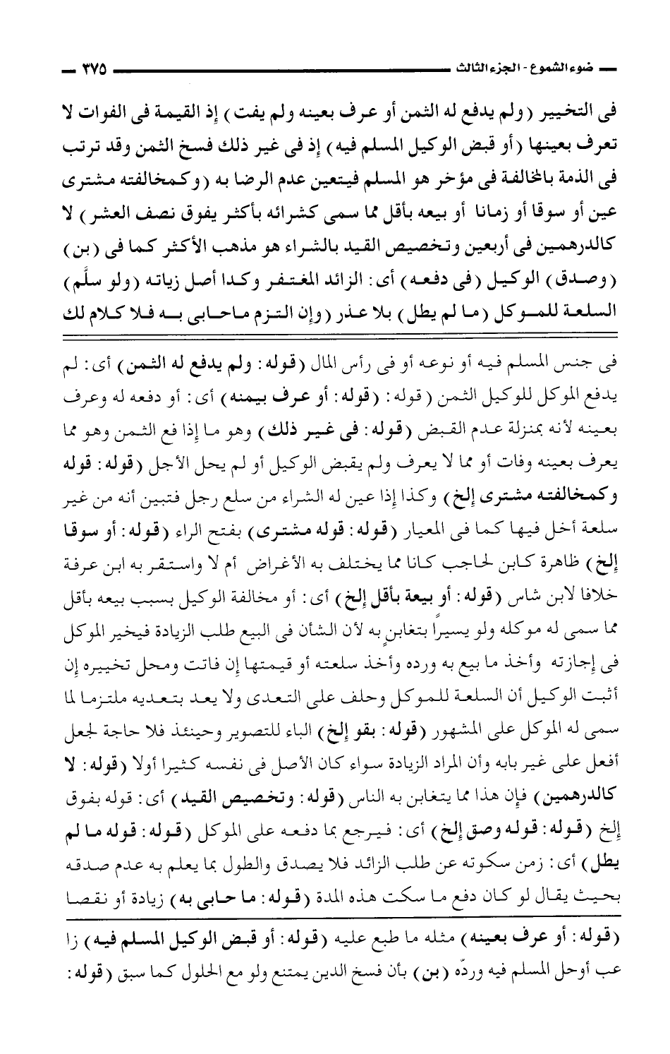 فى جنس المسلم فيه أو نوعه أو فى رأس المال (قوله: ولم يدفع له الثمن) أى: لم يدفع الموكل للوكيل الثمن (قوله: (قوله: أو عرف بيمنه) أى: أو دفعه له وعرف بعينه لأنه بمنزلة عدم القبض (قوله: فى غير ذلك) وهو ما إذا فع الثمن وهو مما يعرف بعينه وفات أو مما لا يعرف ولم يقبض الوكيل أو لم يحل الأجل (قوله: قوله وكمخالفته مشترى إلخ) وكذا إذا عين له الشراء من سلع رجل فتبين أنه من غير سلعة أخل فيها كما فى المعيار (قوله: قوله مشترى) بفتح الراء (قوله: أو سوقا إلخ) ظاهرة كابن الحاجب كانا مما يختلف به الأغراض أم لا واستقر به ابن عرفة خلافا لابن شاس (قوله: أو بيعة بأقل إلخ) أى: أو مخالفة الوكيل بسبب بيعه بأقل مما سمى له موكله ولو يسيرًا بتغابنٍ به لأن الشأن فى البيع طلب الزيادة فيخير الموكل فى إجازته وأخذ ما بيع به ورده وأخذ سلعته أو قيمتها إن فاتت ومحل تخييره إن أثبت الوكيل أن السلعة للموكل وحلف على التعدى ولا يعد بتعديه ملتزما لما سمى له الموكل على المشهور (قوله: بقو إلخ) الباء للتصوير وحينئذ فلا حاجة لجعل أفعل على غير بابه وأن الراد الزيادة سواء كان الأصل فى نفسه كثيرا أولا (قوله: لا كالدرهمين) فإن هذا مما يتغابن به الناس (قوله: وتخصيص القيد) أى: قوله بفوق إلخ (قوله: قوله وصق إلخ) أى: فيرجع بما دفعه على الموكل (قوله: قوله ما لم يطل) أى: زمن سكوته عن طلب الزائد فلا يصدق والطول بما يعلم به عدم صدقه بحيث يقال لو كان دفع ما سكت هذه المدة (قوله: ما حابى به) زيادة أو نقصا