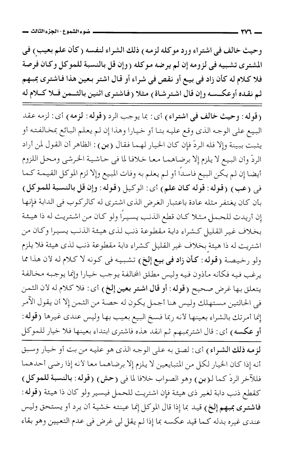لزمه ذلك الشراء) أى: لصق به على الوجه الذى هو عليه من بت أو خيار وسبق أنه إذا كان الخيار لكل من المتبايعين لا يلزم إلا برضاهما معا لأنه إذا رضى أحدهما فللآخر الردّ كما لـ (بن) وهو الصواب خلافا لما فى (حش) (قوله: بالنسبة للموكل) كقطع ذنب دابة لغير ذى هيئة فإن اشتريت للحمل فيسير ولو كان ذا هيئة (قوله: فاشترى بمبهم إلخ) قيد بما إذا قال الموكل إنما عينته خشية أن يرد أو يستحق وليس عندى غيره بدله كما قيد عكسه بما إذا لم يقل لى غرض فى عدم التعيين وهو بقاء