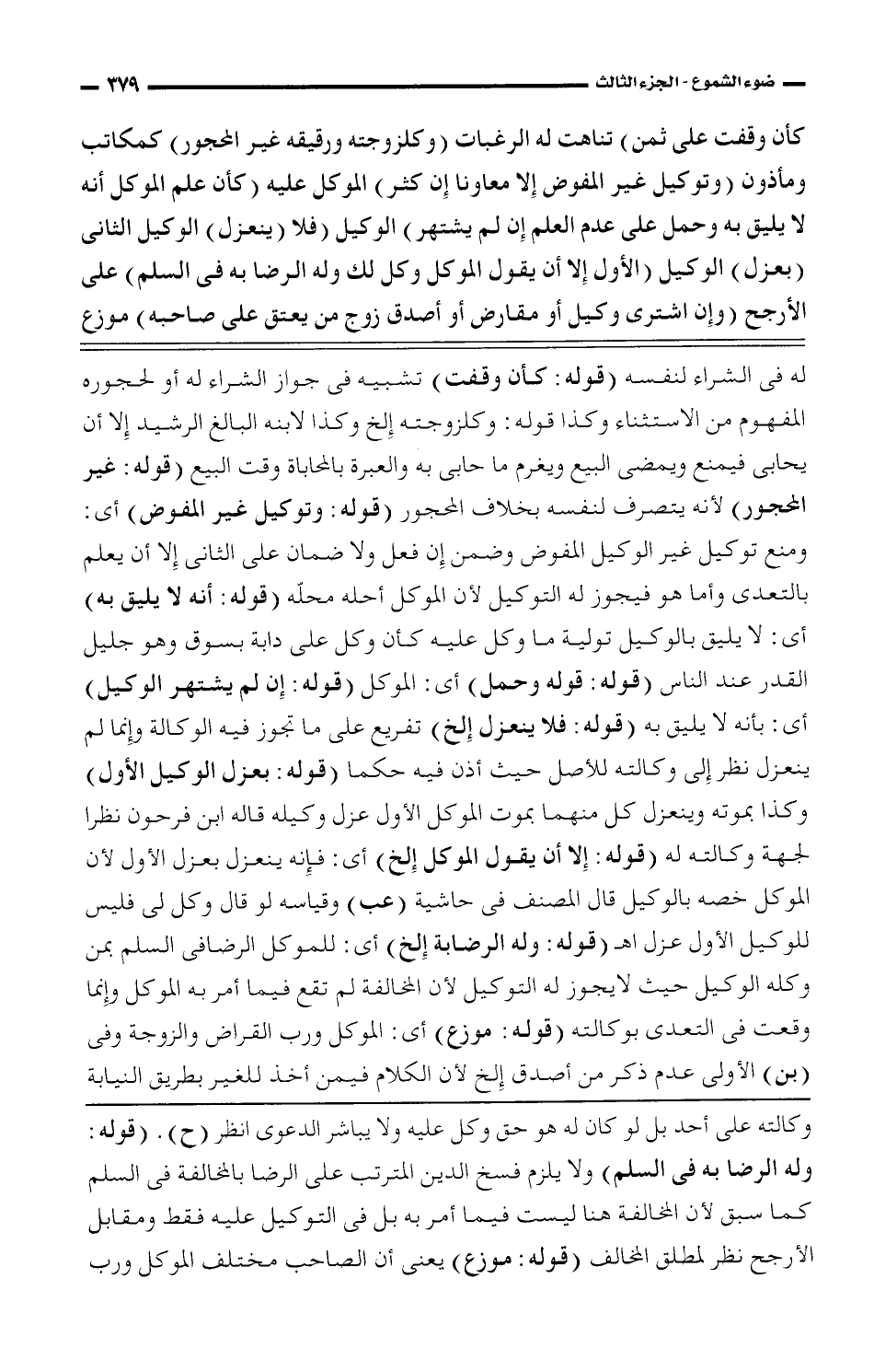 كأن وقفت على ثمن) تناهت له الرغبات (وكلزوجته ورقيقه غير المحجور) كمكاتب ومأذون (وتوكيل غير المفوض إلا معاونا إن كثر) الموكل عليه (كأن علم الموكل أنه لا يليق به وحمل على عدم العلم إن لم يشتهر) الوكيل (فلا (ينعزل) الوكيل الثانى (بعزل) الوكيل (الأول إلا أن يقول الموكل وكل لك وله الرضاب هـ فى السلم) على الأرجح (وإن اشترى وكيل أو مقارض أو أصدق زوج من يعتق على صاحبه) موزع