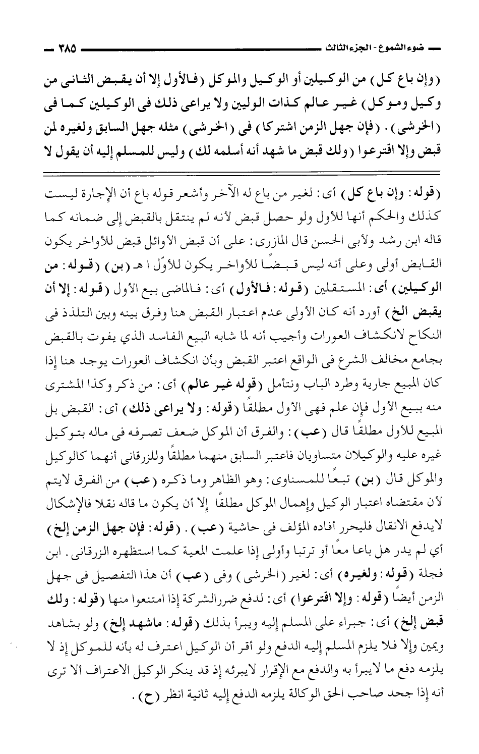 (وإن باع كل) من الوكيلين أو الوكيل والموكل (فالأول إلا أن يقبض الثانى من وكيل وموكل) غير عالم كذات الوليين ولا يراعى ذلك فى الوكيلين كما فى (الخرشى). (فإن جهل الزمن اشتركا) فى (الخرشى) مثله جهل السابق ولغيره لمن قبض وإلا اقترعوا (ولك قبض ما شهد أنه أسلمه لك) وليس للمسلم إليه أن يقول لا