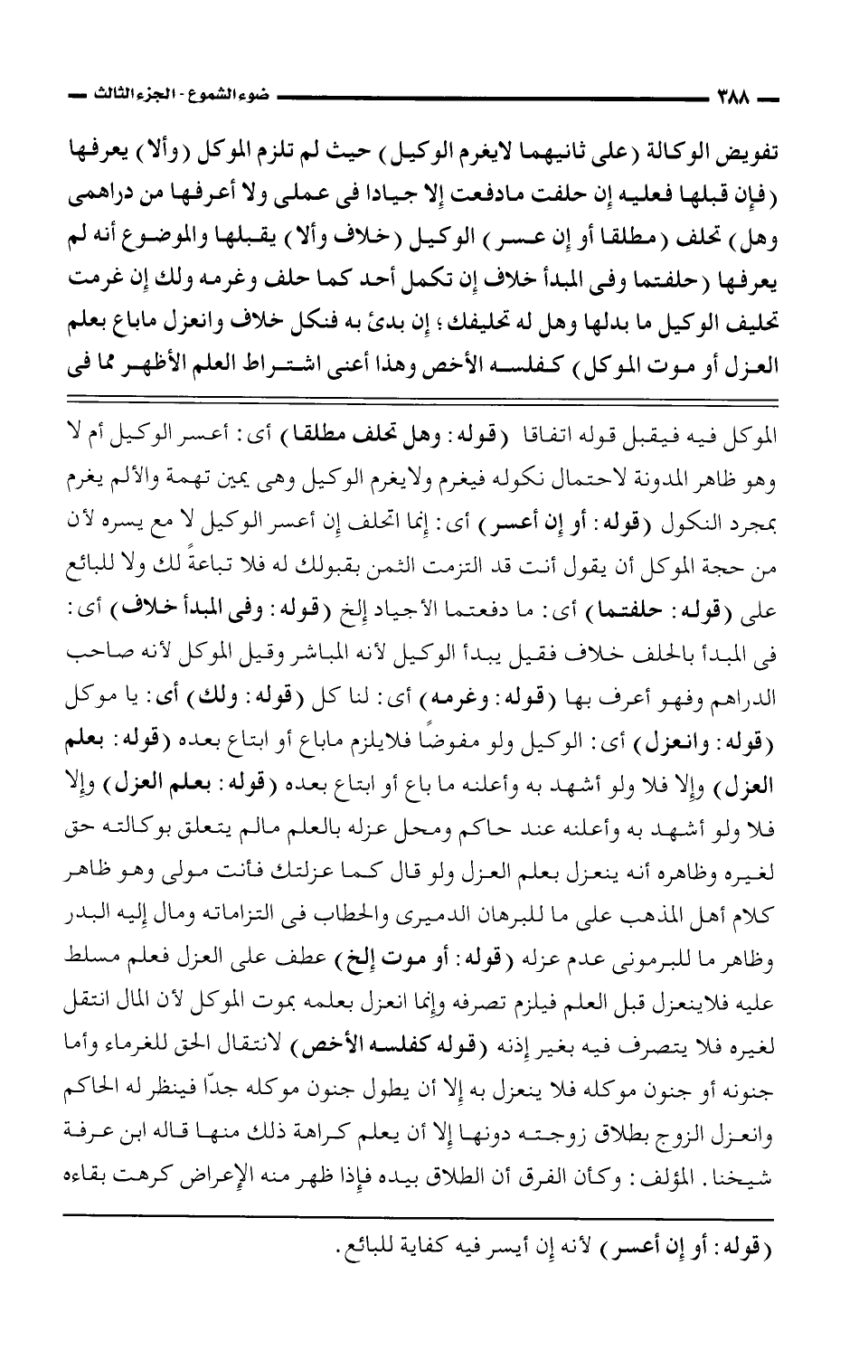 تفويض الوكالة (على ثانيهما لا يغرم الوكيل) حيث لم تلزم الموكل (وألا) يعرفها (فإن قبلها فعليه إن حلفت ما دفعت إلا جيادا فى عملى ولا أعرفها من دراهمى وهل) تحلف (مطلقا أو إن عسر) الوكيل (خلاف وألا) يقبلها والموضوع أنه لم يعرفها (حلفتما وفى المبدأ خلاف إن تكمل أحد كما حلف وغرمه ولك إن غرمت تحليف الوكيل ما بدلها وهل له تحليفك؛ إن بدئ به فنكل خلاف وانعزل ما باع بعلم العزل أو موت الموكل) كفلسه الأخص وهذا أعنى اشتراط العلم الأظهر مما فى