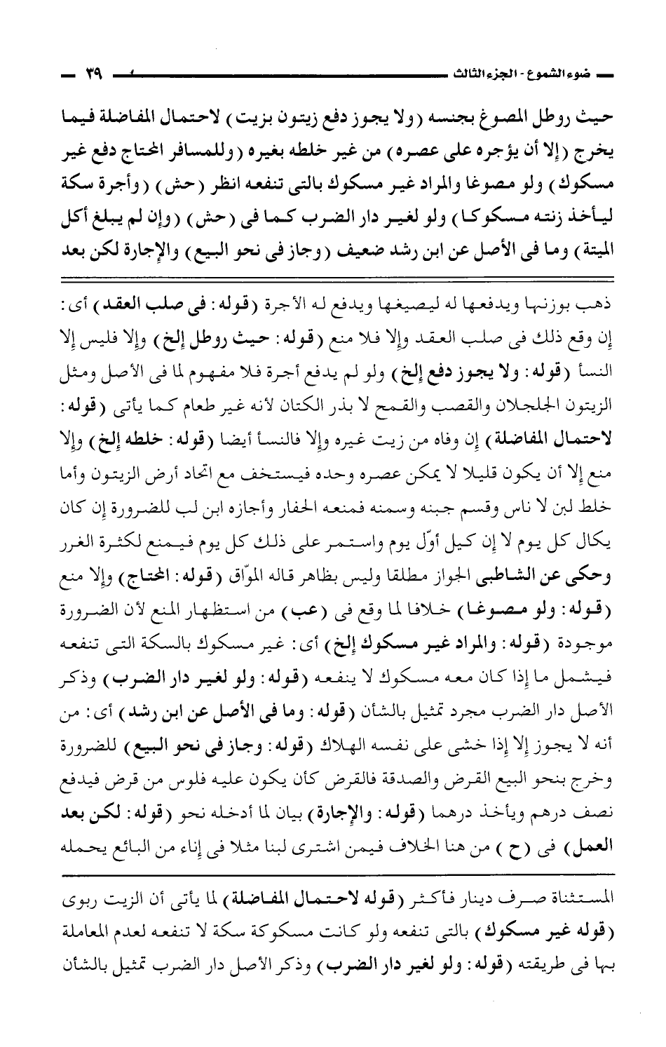ذهب بوزنها ويدفعه له ليصيغها ويدفع له الأجرة (قوله: فى صلب العقد) أى: إن وقع ذلك فى صلب العقد وإلا فلا منع (قوله: حيث روطل إلخ) وإلا فليس إلا النسأ (قوله: ولا يجوز دفع إلخ) ولو لم يدفع أجرة فلا مفهوم لما فى الأصل ومثل الزيتون الجلجلان والقصب والقمح لا بذر الكتان لأنه غير طعام كما يأتى (قوله: لاحتمال المفاضلة) إن وفاه من زيت غيره وإلا فالنسأ أيضا (قوله: خلطه إلخ) وإلا منع إلا أن يكون قليلا لا يمكن عصره وحده فيستخف مع اتحاد أرض الزيتون وأما خلط لبن لا ناس وقسم جبنه وسمنه فمنعه الحفار وأجازه ابن لب للضرورة إن كان يكال كل يوم لا إن كيل أوّل يوم واستمر على ذلك كل يوم فيمنع لكثرة الغرر وحكى عن الشاطبى الجواز مطلقا وليس بظاهر قاله الموّاق (قوله: المحتاج) وإلا منع (قوله: ولو مصوغا) خلافا لما وقع فى (عب) من استظهار المنع لأن الضرورة موجودة (قوله: والمراد غير مسكوك إلخ) أى: غير مسكوك بالسكة التى تنفعه فيشمل ما إذا كان معه مسكوك لا ينفعه (قوله: ولو لغير دار الضرب) وذكر الأصل دار الضرب مجرد تمثيل بالشأن (قوله: وما فى الأصل عن ابن رشد) أى: من أنه لا يجوز إلا إذا خشى على نفسه الهلاك (قوله: وجاز فى نحو البيع) للضرورة وخرج بنحو البيع القرض والصدقة فالقرض كأن يكون عليه فلوس من قرض فيدفع نصف درهم ويأخذ درهما (قوله: والإجارة) بيان لما أدخله نحو (قوله: لكن بعد العمل) فى (ح) من هنا الخلاف فيمن اشترى لبنا مثلا فى إناء من البائع يحمله
