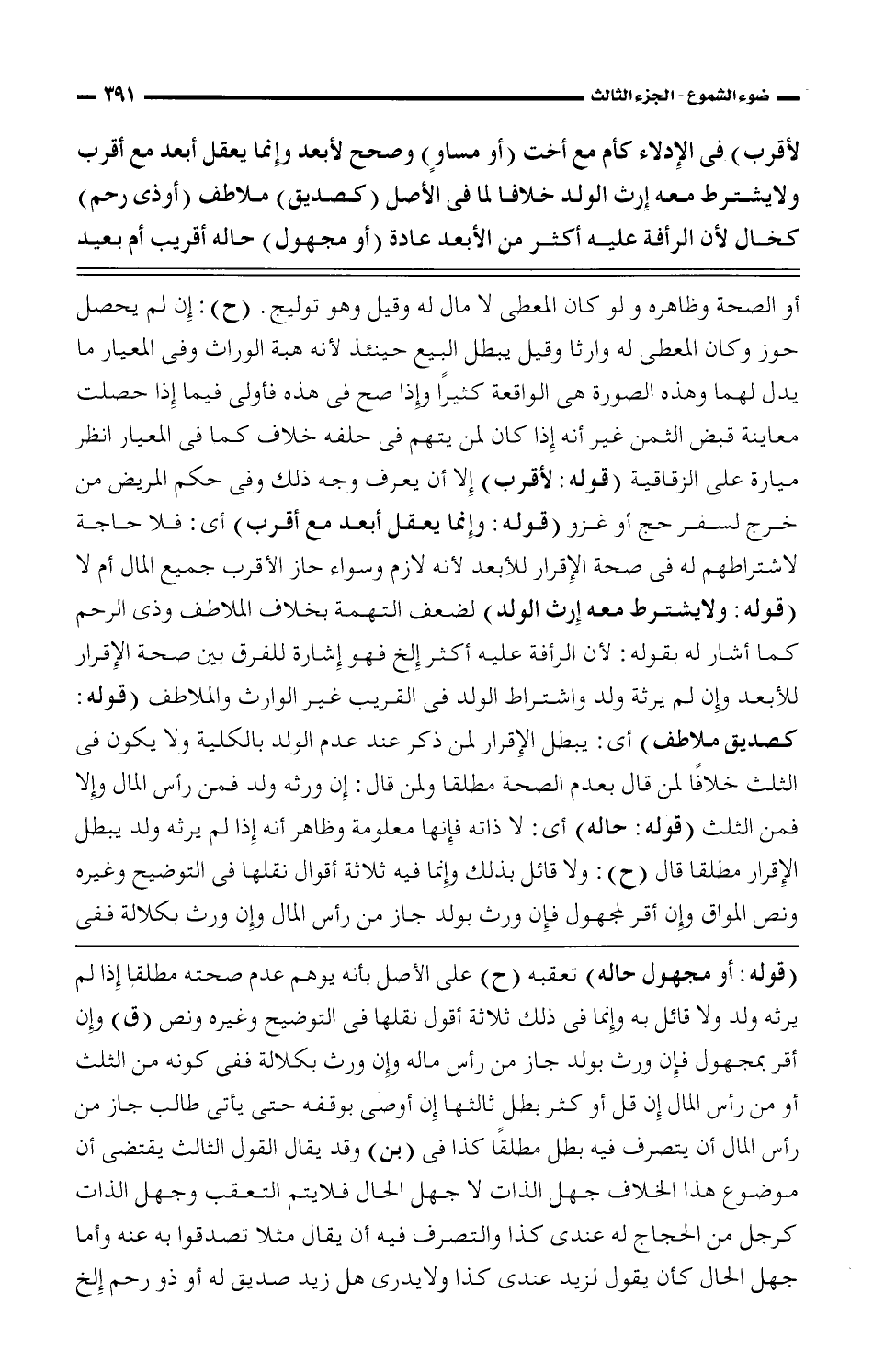 أو الصحة وظاهره ولو كان المعطى لا مال له وقيل وهو توليج. (ح): إن لم يحصل حوز وكان المعطى له وارثا وقيل يبطل البيع حينئذ لأنه هبة الوراث وفى المعيار ما يدل لهما وهذه الصورة هى الواقعة كثيرًا وإذا صح فى هذه فأولى فيما إذا حصلت معاينة قبض الثمن غير أنه إذا كان لمن يتهم فى حلفه خلاف كما فى المعيار انظر ميارة على الزقاقية (قوله: لأقرب) إلا أن يعرف وجه ذلك وفى حكم المريض من خرج لسفر حج أو غزو (قوله: وإنما يعقل أبعد مع أقرب) أى: فلا حاجة لاشتراطهم له فى صحة لإقرار للأبعد لأنه لازم وسواء حاز الأقرب جميع المال أم لا (قوله: ولا يشترط معه إرث الولد) لضعف التهمة بخلاف الملاطف وذى الرحم كما أشار له بقوله: لأن الرأفة عليه أكثر إلخ فهو إشارة للفرق بين صحة الإقرار للأبعد وإن لم يرثة ولد واشتراط الولد فى القريب غير الوارث والملاطف (قوله: كصديق ملاطف) أى: يبطل الإقرار لمن ذكر عند عدم الولد بالكلية ولا يكون فى الثلث خلافًا لمن قال بعدم الصحة مطلقا ولمن قال: إن ورثه ولد فمن رأس المال وإلا فمن الثلث (قوله: حاله) أى: لا ذاته فإنها معلومة وظاهر أنه إذا لم يرثه ولد يبطل الإقرار مطلقا قال (ح): ولا قائل بذلك وإنما فيه ثلاثة أقوال نقلها فى التوضيح وغيره ونص المواق وإن أقر المجهول فإن ورث بولد جاز من رأس المال وإن ورث بكلالة ففى