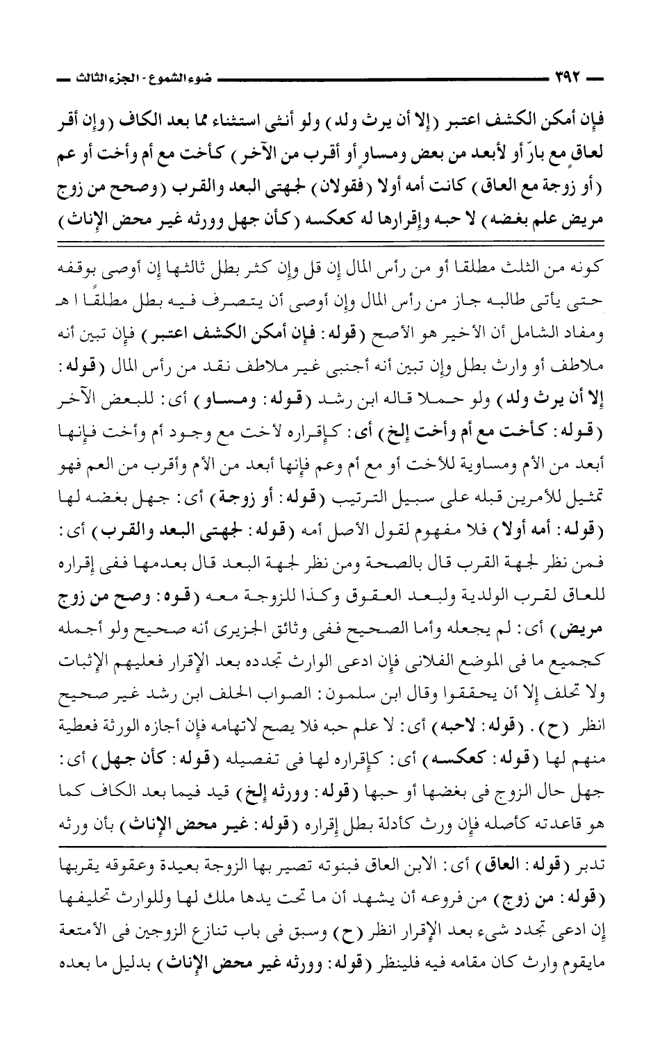 تدبر (قوله: العاق) أى: الابن العاق فبنوته تصير بها الزوجة بعيدة وعقوقه يقربها (قوله: من زوج) من فروعه أن يشهد أن ما تحت يدها ملك لها وللوارث تحليفها إن ادعى تجدد شئ بعد الإقرار انظر (ح) وسبق فى باب تنازع الزوجين فى الأمتعة ما يقوم وارث كان مقامه فيه فلينظر (قوله: وورثه غير محض الإناث) بدليل ما بعده