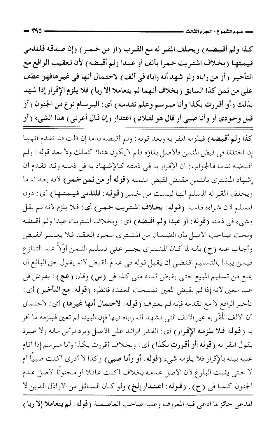 كذا ولم أقبضه) فيلزمه المقر به وبعد قوله: ولم أقبضه ندما إن قلت قد تقدم أنهما إذا اختلفا فى قبض المثمن فالأصل بقاؤه فلم لا يكون هناك كذلك ولا بعد قوله: ولم أقبضه ندما فالجواب: أن الإقرار به فى ذمته كالإشهاد به فى ذمته وقد تقدم أن إشهاد المشترى بالثمن مقتض لقبضه مثمنه (قوله أو من ثمن خمر) لأنه يعد ندما ويحلف المقر له المسلم عنها ليست من خمر (قوله: فللذمى قيمتها) أى: دون المسلم لأن شراءه فاسد (قوله: بخلاف اشتريت خمر) أى: فلا يلزم لأنه لم يقل بشئ فى ذمته (قوله: أو عبدًا ولم أقبضه) أى: وبخلاف اشتريت عبدا ولم أقبضه وبحث صاحب الأصل بأن الضمان من المشترى مجرد العقد فلا يعتبر القبض وأجاب عنه (ح) بأنه لما كان المشترى يجبر على تسليم الثمن أوّلاً عند التنازع فيمن يبدأ بالتسليم اقتضى أن يقبل قوله فى عدم القبض لأنه يقول حق البائع أن يمنع من تسليم المبيع حتى يقبض ثمنه منى كذا فى (بن) وقال (عج): يفرض فى عبد معين لأنه إذا لم يقبض المعين انفسخت العقدة فانظره (قوله: مع التأخير) أى: تأخير الرافع لا مع تقدمه فإنه لم يعترف (قوله: لاحتمال أنها غيرها) أى: لاحتمال أن الألف المُقّر به غير الألف التى تشهد أنه راباه فيها فإن البينة لم تعين فيلزمه ما أقر به (قوله: فلا يلزمه الإقرار) أى: القدر الزائد على الأصل ويرد لرأس ماله ولا عبرة بقول المقر له (قوله: أو أقررت بكذا) أى: وبخلاف أقررت بكذا وأنا مبرسم إذا أقام عليه بينه بالإقرار فلا يلزمه شئ (قوله: أو وأنا صبى) وكذا لا أدرى أكنت صيبًا أم لا حتى يثبت البلوغ لأن الأصل عدمه بخلاف أكنت عاقلا أو مجنونًا الأصل عدم الجنون كما فى (ح). (قوله: اعتذار إلخ) ولو كان السائل من الأراذل الذين لا