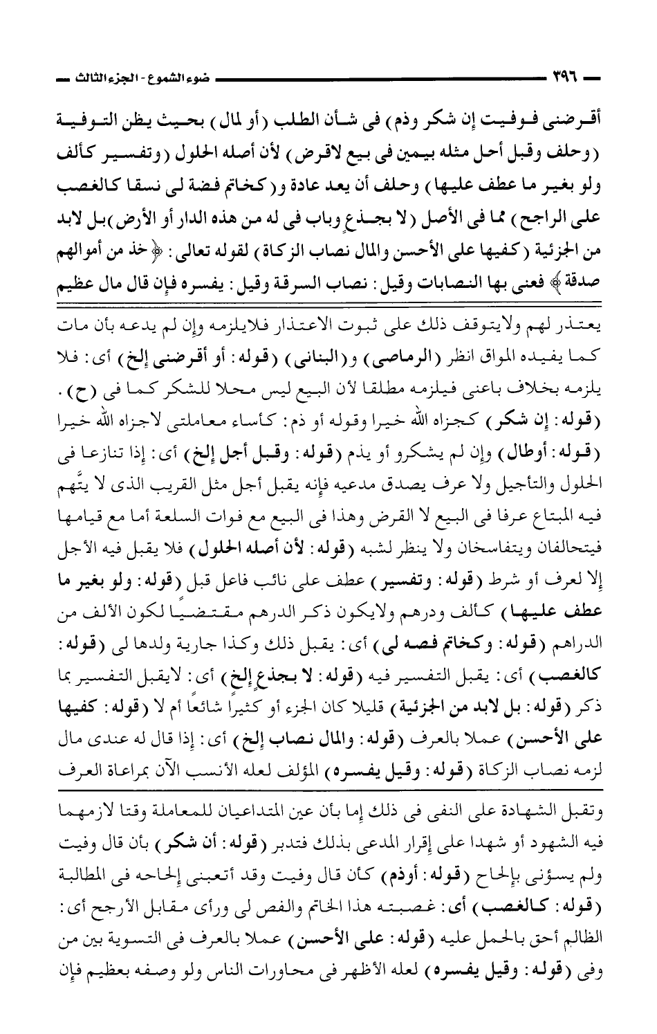 أقرضنى فوفيت إن شكر وذم) فى شأن الطلب (أو لمال) بحيث يظن التوفية (وحلف وقبل أحل مثله بيمين فى بيع لاقرض) لأن أصله الحلول (وتفسير كألف ولو بغير ما عطف عليها) وحلف أن يعد عادة و (كخاتم فضة لى نسقا كالغصب على الراجح) مما فى الأصل (لا بجذعٍ وباب فى له من هذه الدار أو الأرض) بل لابد من الجزئية (كفيها على الأحسن والمال نصاب الزكاة) لقوله تعالى: خذ من أموالهم صدقة} فعنى بها النصابات وقيل: نصاب السرقة وقيل: يفسره فإنقال مال عظيم
