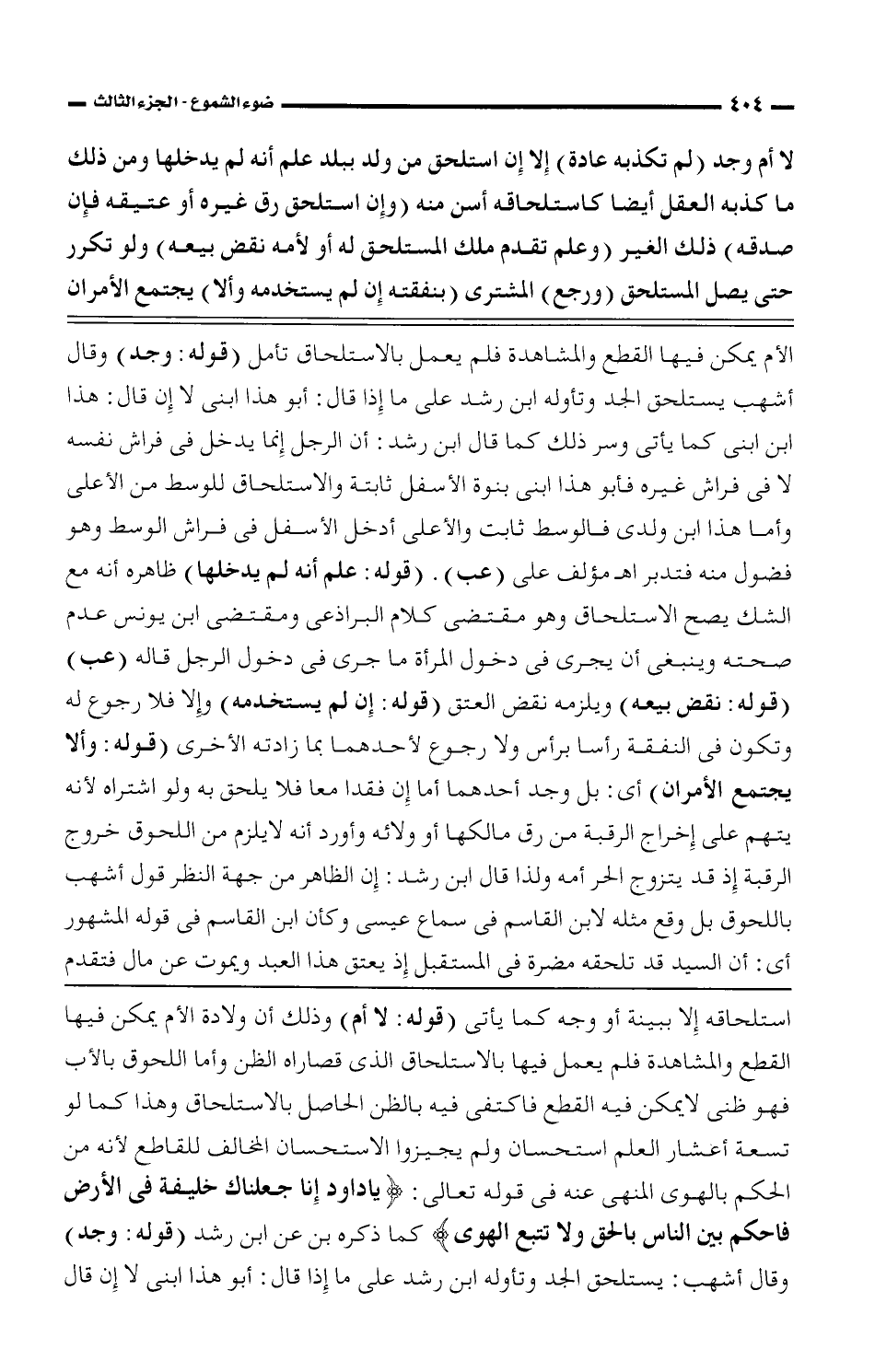 الأم يمكن فيها القطع والمشاهدة فلم يعمل بالاستلحق تأمل (قوله: وجد) وقال أشهب يستلحق الجد وتأوله ابن رشد على ما إذا قال: أبو هذا ابنى لا إن قال: هذا ابن ابنى كما يأتى وسر ذلك كما قال ابن رشد: أن الرجل إنما يدخل فى فراش نفسه لا فى فراش غيره فأبو هذا ابنى بنوة الأسفل ثابتة والاستلحاق للوسط من الأعلى وأما هذا ابن ولدى فالوسط ثابت والأعلى أدخل الأسفل فى فراش الوسط وهو فضول منه فتدبر اهـ مؤلف على (عب). (قوله: علم أنه لم يدخلها) ظاهره أنه مع الشك يصح الاستلحاق وهو مقتضى كلام البراذعى ومقتضى ابن يونس عدم صحته وينبغى أن يرجى فى دخول المرأة ما جرى فى دخول الرجل قاله (عب) (قوله: نقض بيعه) ويلزمه نقض العتق (قوله: إن لم يستخدمه) وإلا فلا رجوع له وتكون فى النفقة رأسا برأس ولا رجوع لأحدهما بما زادته الأخرى (قوله: وألا يجتمع الأمران) أى: بل وجد أحدهما أما إن فقدا معا فلا يلحق به ولو اشتراه لأنه يتهم على إخراج الرقبة من رق مالكها أو ولائه وأورد أنه لا يلزم من اللحوق خروج الرقبة إذ قد يتزوج الحر أمه ولذا قال ابن رشد: إن الظاهر من جهة النظر قول أشهب باللحوق بل وقع مثله لابن القاسم فى سماع عيسى وكأن ابن القاسم فى قوله المشهور أى: أن السيد قد تلحقه مضرة فى المستقبل إذ يعتق هذا العبد ويموت عن مال فتقدم