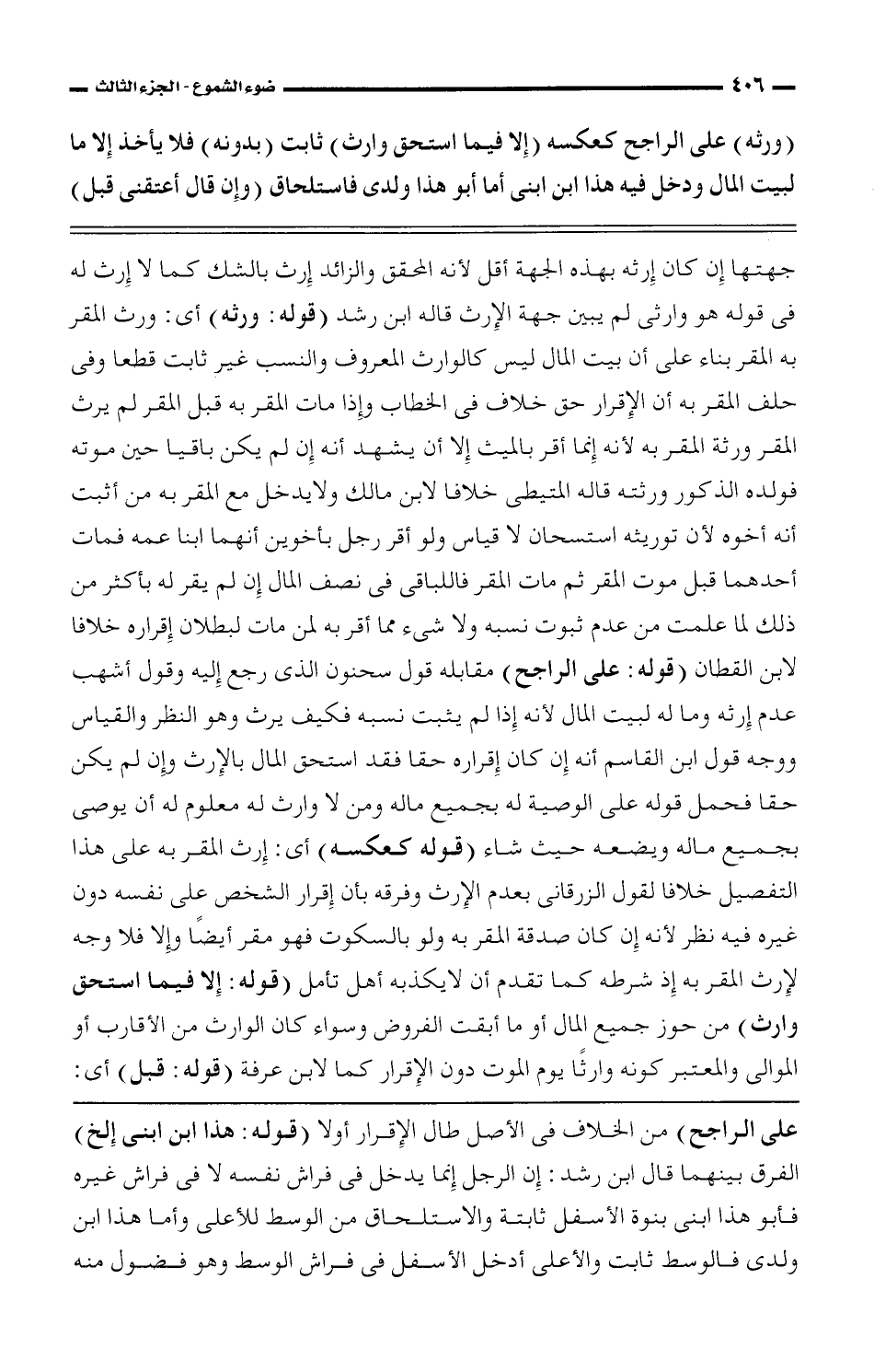 جهتها إن كان إرثه بهذه الجهة أقل لأنه المحقق والزائد إرث بالشك كما لا إرث له فى قوله هو وارثى لم يبين جهة الإرث قاله ابن رشد (قوله: ورثه) أى: ورث المقر به المقر بناء على أن بيت المال ليس كالوارث المعروف والنسب غير ثابت قطعا وفى حلف المقر به أن الإقرار حق خلاف فى الخطاب وإذا مات المقر به قبل القمر لم يرث المقر ورثة المقر به لأنه إنما أقرب بالميث إلا أن يشهد أنه إن لم يكن باقيا حين موته فولده الذكور ورثته قاله المتيطى خلافا لابن مالك ولا يدخل مع المقر به من أثبت أنه أخوه لأن توريثه قال المتيطى خلافا لابن مالك ولا يدخل مع المقر به من أثبت أنه أخوه لأن توريثه استسحان لا قياس ولو أقر رجل بأخونن أنهما ابنا عمه فمات أحدهما قبل موت المقر ثم مات المقر فاللباقى فى نصف المال إن لم يقر له بأكثر من ذلك لما علمت من عدم ثبوت نسبه ولا شئ مما أقر به لمن مات لبطلان إقراره خلافا لابن القطان (قوله: على الراجح) مقابله قول سحنون الذى رجع إليه وقول أشهب عدم إرثه وما له لبيت المال لأنه إذا لم يثبت نسبه فكيف يرث وهو النظر والقياس ووجه قول ابن القاسم أنه إن كان إقراره حقا فقد استحق المال بالإرث وإن لم يكن حقا فحمل قوله على الوصية له بجميع ماله ومن لا وارث له معلوم له أن يوصى بجميع ماله ويضعه حيث شاء (قوله كعكسه) أى: إرث المقر به على هذا التفصيل خلافا لقول الزرقانى بعدم الإرث وفرقه بأن إقرار الشخص على نفسه دون غيره فيه نظر لأنه إن كان صدقة المقر به ولو بالسكوت فهو مقر أيضًا وإلا فلا وجه لإرث المقر به إذ شرطه كما تقدم أن لا يكذبه أهل تأمل (قوله: إلا فيما استحق وارث) من حوز جميع المال أو ما أبقت الفروض وسواء كان الوارث من الأقارب أو الموالى والمعتبر كونه وارثًا يوم الموت دون الإقرار كما لابن عرفة (قوله: قبل) أى: