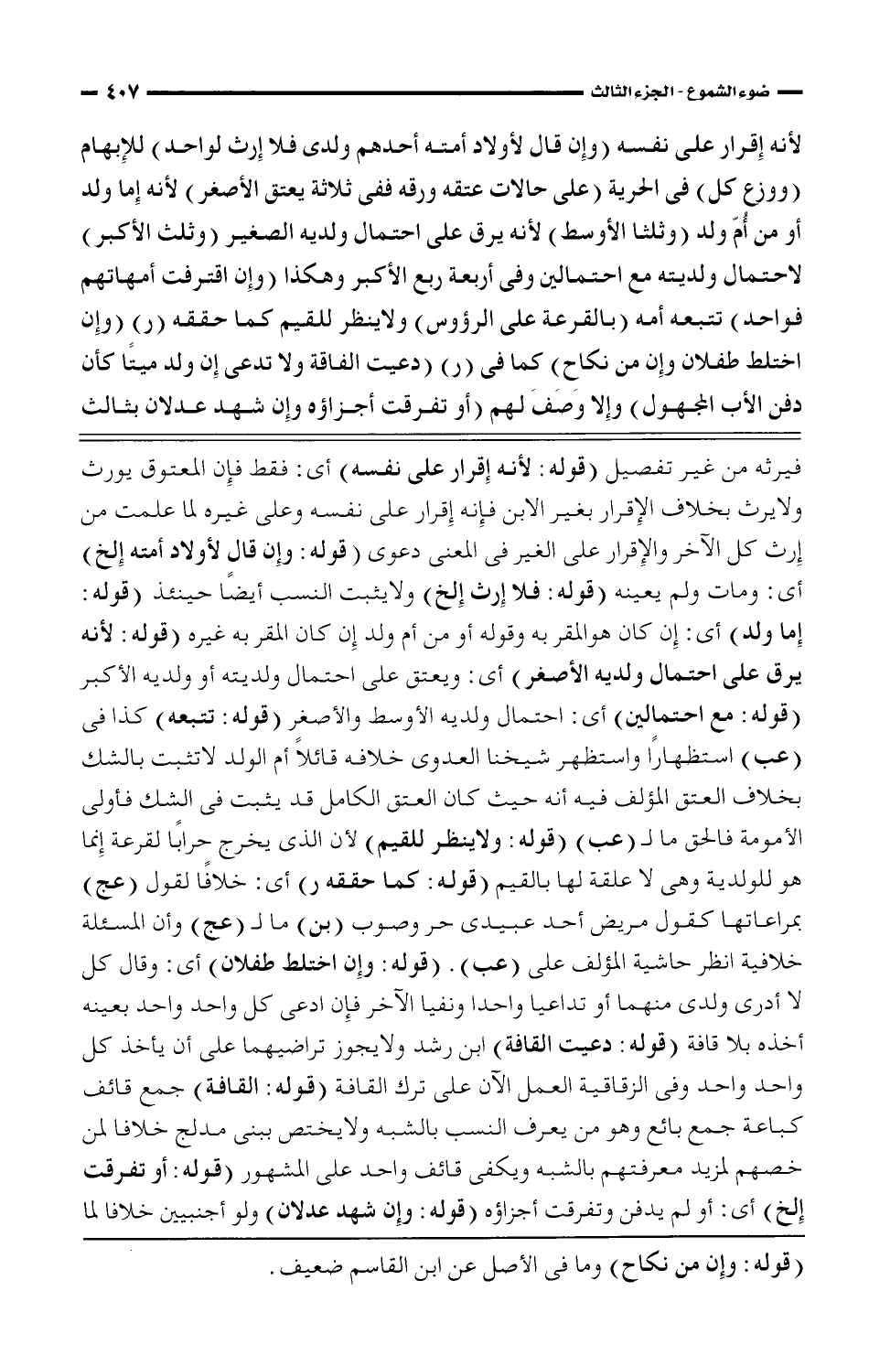 فيرثه من غير تفصيل (قوله: لأنه إقرار على نفسه) أى: فقط فإن المعتوق يورث ولا يرث بخلاف الإقرار بغير الابن فإنه إقرار على نفسه وعلى غيره لما علمت من إرث كل الآخر والإقرار على الغير فى المعنى دعوى (قوله: وإن قال لأولاد أمته إلخ) أى: ومات لم يعينه (قوله: فلا إرث إلخ) ولا يثبت النسب أيضًا حينئذ (قوله: إما ولد) أى: إن كان هو لمقر به وقوله أو من أم ولد إن كان المقر به غيره (قوله: لأنه يرق على احتمال ولديه الأصغر) أى: ويعتق على احتمال ولديته أو ولديه الأكثر (قوله: مع احتمالين) أى: احتمال ولديه الأوسط والأصغر (قوله: تتبعه) كذا فى (عب) استظهارًا واستظهر شيخنا العدوى خلافه قائلًا أم الولد لا تثبت بالشك بخلاف العتق المؤلف فيه أنه حيث كان العتق الكامل قد يثبت فى الشك فأولى الأمومة فالحق ما لـ (عب) (قوله: ولا ينظر للقيم) لأن الذى يخرج حرابا لقرعة إنما هو للولدية وهى لا علقة لها بالقيم (قوله: كما حققه ر) أى: خلافًا لقول (عج) بمراعاتها كقول مريض أحد عبيدى حر وصوب (بن) ما لـ (عج) وأن المسئلة خلافية انظر حاشية المؤلف على (عب). (قوله: وإن اختلط طفلان* أى: وقال كل لا أدرى ولدى منهما أو تداعيا واحدا ونفيا الآخر فإن ادعى كل واحد واحد بعينه أخذه بلا قافة (قوله: دعيت القافة) ابن رشد ولا يجوز تراضيهما على أن يأخذ كل واحد واحد فى الزقاقية العمل الآن على ترك القافة (قوله: القافة) جمع قائف طباعة جمع بائع وهو من يعرف النسب بالشبة ولا يختص ببنى مدلج خلافا لمن خصهم لمزيد معرفتهم بالشبه ويكفى قائف واحد على المشهور (قوله: أو تفرقت إلخ) أى: أو لم يدفن وتفرقت أجزاؤه (قوله: وإن شهد عدلان) ولو أجنبيين خلافا لما