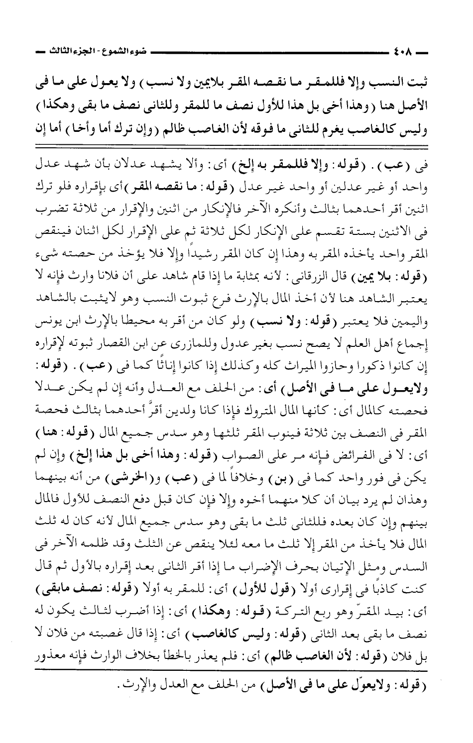 فى (عب). (قوله: وإلا فللمقر به إلخ) أى: وألا يشهد عدلان بأن شهد عدل واحد أو غير عدلين أو واحد غير عدل (قوله: ما نقصه المقر) أى بإقراره فلو ترك اثنين أقر أحدهما بثالث وأنكره الآخر فالإنكار من اثنين والإقرار من ثلاثة تضرب فى الاثنين بستة تقسم على الإنكار لكل ثلاثة ثم على الإقرار لكل اثنان فينقص المقر واحد يأخذه المقر به وهذا إن كان المقر رشيدا وإلا فلا يؤخذ من حصته شئ (قوله: بلا يمين) قال الزرقانى: لأنه بمثابة ما إذا قام شاهد على أن فلانا وارث فإنه لا يعتبر الشاهد هنا لأن أخذ المال بالإرث فرع ثبوت النسب وهو لا يثبت بالشاهد واليمين فلا يعتبر (قوله: ولا نسب) ولو كان من أقر به محيطا بالإرث ابن يونس إجماع أهل العلم لا يصح نسب بغير عدول وللمازرى عن ابن القصار ثبوته لإقراره إن كانوا ذكورا وحازوا الميراث كله وكذا إذا كانوا إناثًا كما فى (عب). (قوله: ولا يعول على ما فى الأصل) أى: من الحلف مع العدل وأنه إن لم يكن عدلا فحصته كالمال أى: كأنها المال المتروك فإذا كانا ولدين أقرَّ أحدهما بثالث فحصة المقر فى النصف بين ثلاثة فينوب المقر ثلثها وهو سدس جميع المال (قوله: هنا) أى: لا فى الفرائض فإنه مر على الصواب (قوله: وهذا أخى بل هذا إلخ) وإن لم يكن فى فور واحد كما فى (بن) وخلافًا لما فى (عب) و (الخرشى) من أنه بينهما وهذان لم يرد بيان أن كلا منهما أخوه وإلا فإن كان قبل دفع النصف للأول فالمال بينهم وإن كان بعده فللثانى ثلث ما بقى وهو سدس جميع المال لأنه كان له ثلث المال فلا يأخذ من المقر إلا ثلث ما معه لئلا ينقص عن الثلث وقد ظلمه الآخر فى السدس ومثل الإتيان بحرف الإضراب ما إذا أقر الثانى بعد إقراره بالأول ثم قال كنت كاذبًا فى إقرارى أولا (قوله للأول) أى: للمقر به أولا (قوله: نصف ما بقى) أى: بيد المقرّ وهو ربع التركة (قوله: وهكذا) أى: إذا أضرب لثالث يكون له نصف ما بقى بعد الثانى (قوله: وليس كالغاصب) أى: إذا أضرب لثالث يكون له نصف ما بقى بعد الثانى (قوله: وليس كالغاصب) أى: إذا قال غصبته من فلان لا بل فلان (قوله: لأن الغاصب ظالم) أى: فلم يعذر بالخطأ بخلاف الوارث فإنه معذور