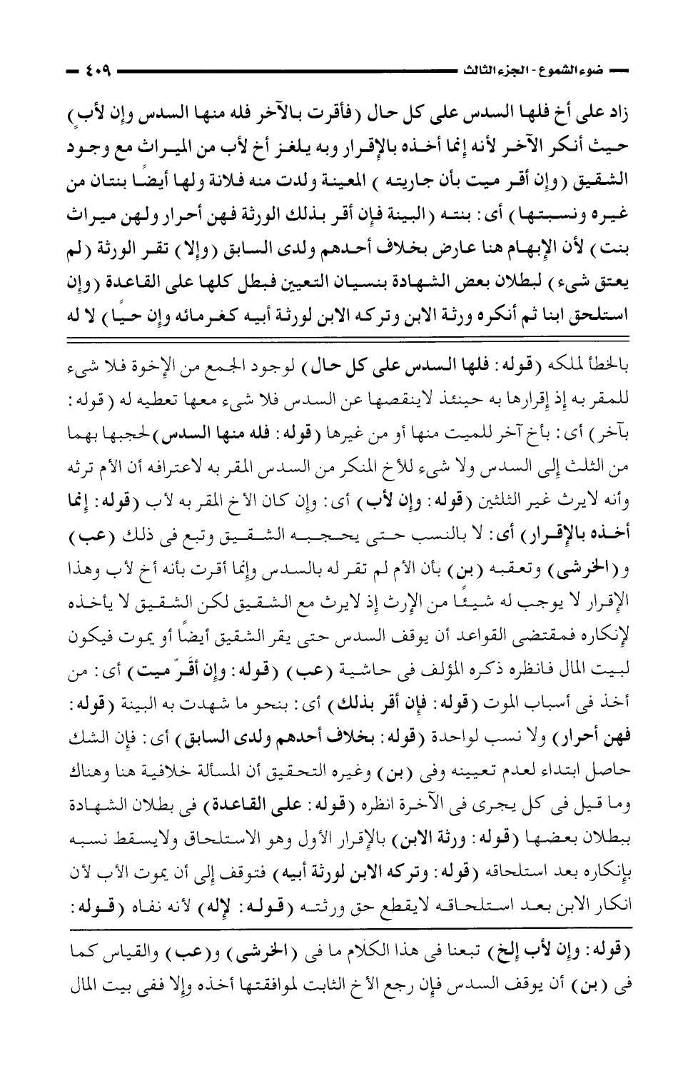 زاد على أخ فله االسدس على كل حال (فأقرت بالآخر فله منها السدس وإن لأبٍ) حيث أنكر الآخر لأنه إنما أخذه بالإقرار وبه يلغز أخ لأب من الميراث مع وجود الشقيق (وإن أقر ميت بأن جاريته) المعينة ولذدت منه فلانة ولها أيضًا بنتان من غيره ونسبتها) أى: بنته (البينة فإن أقر بذلك الورثة فهن أحرار ولهن ميراث بنت) لأن الإبهام هنا عارض بخلاف أحدهم ولدى السابق (وإلا) تقر الورثة (لم يعتق شئ) لبطلان بعض الشهادة بنسيان التعيين فبطل كلها على القاعدة (وإن استلحق ابنا ثم أنكره ورثة الابن وتركه الابن لورثة أبيه كغرمائه وإن حيًا) لا له