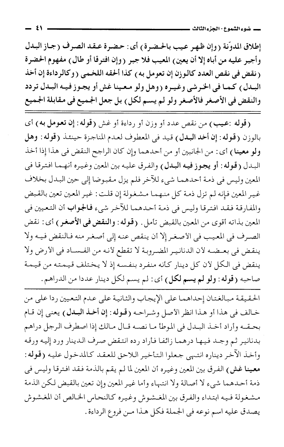 إطلاق المدوّنة (وإن ظهر عيب بالحضرة) أى: حضرة عقد الصرف (جاز البدل وأجبر عليه من أباه إلا أن يعين) المعيب فلا جبر (وإن افترقا أو طال) مفهوم الحضرة (نقض فى نقص العدد كالوزن إن تعومل به) كذا ألحقه اللخمى (وكالرداءة إن أخذ البدل) كما فى الخرشى وغيره (وهل ولو معينا غش أو يجوز فيه البدل تردد والنقض فى الأصغر فالأصغر ولو لم يسم لكل) بل جعل الجميع فى مقابلة الجميع