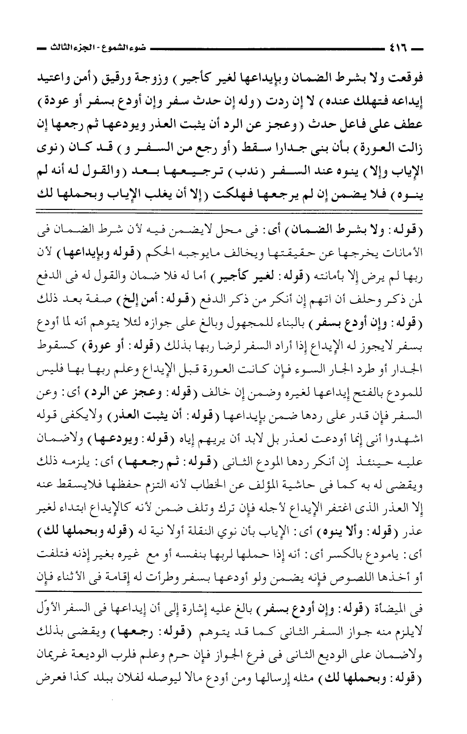 فوقعت ولا بشرط الضمان وبإيداعها لغير كأجير) وزوجة ورقيق (أمن واعتيد إيداعه فتهلك عنده) لا إن ردت (وله إن حدث سفر وإن أودع بسفر أو عودة) عطف على فاعل حدث (وعجز عن الرد أن يثبت العذر ويودعها ثم رجعها إن زالت العورة) بأن بنى جدارا سقط (أو رجع من السفر و) قد كان (نوى الإياب وإلا) ينوه عند السفر (ندب) ترجيعها بعد (والقول له أنه لم ينوه) فلا يضمن إن لم يرجعها فهلكت (إلا أن يغلب الإياب وبحملها لك