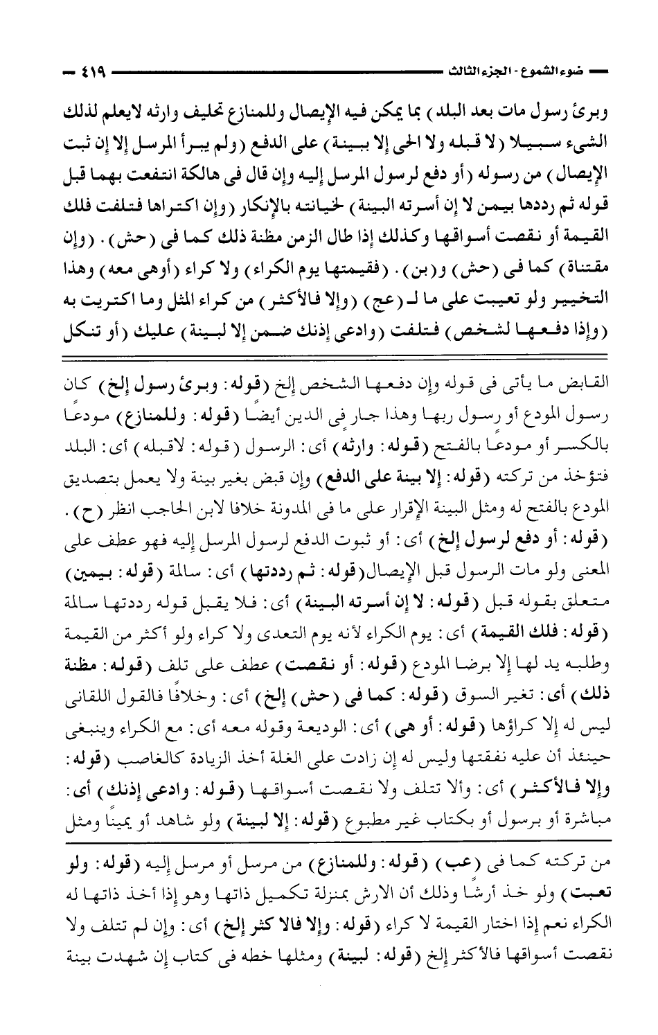 رسول المودع أو رسول ربها وهذا جارٍ فى الدين أيضًا (قوله: وللمنازع) مودعًا بالكسر أو مودعًا بالفتح (قوله: وارثه) أى: الرسول (قوله: لا قبله) أى: البلد فتؤخذ من تركته (قوله: إلا بينة على الدفع) وإن قبض بغير بينة ولا يعمل بتصديق المودع بالفتح له ومثل البنية الإقرار على ما فى المدونة خلافا لابن الحاجب انظر (ح). (قوله: أو دفع لرسول إلخ) أى: أو ثبوت الدفع لرسول المرسل إليه فهو عطف على المعنى ولو مات الرسول قل الإيصال (قوله: ثم رددتها) أى: سالمة (قوله: بيمين) متعلق بقوله قبل (قوله: لا إن أسرته البينة) أى: فلا يقبل قوله رددتها سالمة (قوله: فلك القيمة) أى: يوم الكراء لأنه يوم التعدى ولا كراء ولو أكثر من القيمة وطلبه يد لها إلا برضا لودع (قوله: أو نقصت) عطف على تلف (قوله: مظنة ذلك) أى: تغير السوق (قوله: كما فى (حش) إلخ) أى: وخلافًا فالقول اللقانى ليس له إلا كراؤها (قوله: أو هى) أى: الوديعة وقوله معه أى: مع الكراء وينبغى حينئذ أن عليه نفقتها ولبس له إن زادت على الغلة أخذ الزيادة كالغاصب (قوله: وإلا فالأكثر) أى: وألا تتلف ولا نقصت أسواقها (قوله: وادعى إذنك) أى: مباشرة أو برسول أو بكتاب غير مطبوع (قوله: إلا لبينة) ولو شاهد أو يمينًا ومثل