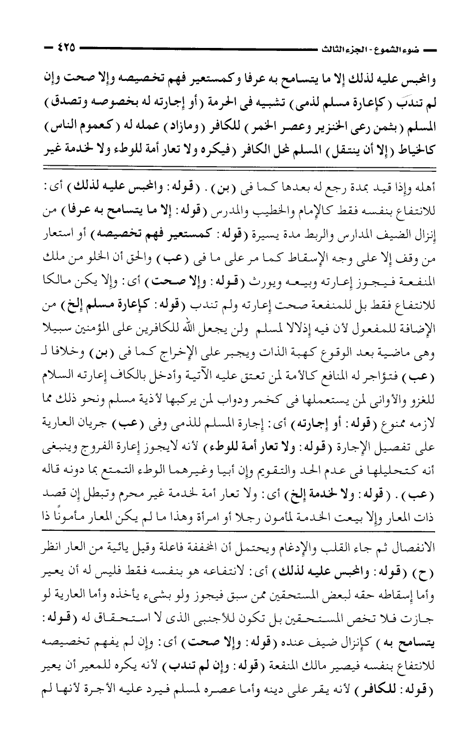 أهله وإذا قيد بمدة رجع له بعدها كما فى (بن). (قوله: والمحبس عليه لذلك) أى: للانتفاع بنفسه فقط كالإمام والخطيب والمدرس (قوله: إلا ما يتسامح به عرفا) من إنزال الضيف المدارس والربط مدة يسيرة (قوله: كمستعير فهم تخصيصه) أو استعار من وقف إلا على وجه الإسقاط كما مر على ما فى (عب) والحق أن الخلو من ملك المنفعة فيجوز إعارته وبيعه ويورث (قوله: وإلا صحت) أى: وإلا يكن مالكا للانتفاع فقط بل للمنفعة صحت إعارته ولم تندب (قوله: كإعارة مسلم إلخ) من الإضافة للمفعول لأن فيه إذلالا لمسلم ولن يجعل الله للكافرين على المؤمنين سبيلا وهى ماضية بعد الوقوع كهبة الذات ويجبر على الإخراج كما فى (بن) وخلافا لـ (عب) فتؤاجر له المنفعة كالأمة لمن تعتق عليه الآتية وأدخل بالكاف إعارته السلام للغزو والأوانى لمن يستعملها فى كخمر ودواب لمن يركبها لأذية مسلم ونحو ذلك مما لازمه ممنوع (قوله: أو إجارته) أى: إجارة المسلم للذمى وفى (عب) جريان العارية على تفصيل الإجارة (قوله: ولا تعار أمة للوطء) لأنه لا يجوز إعارة الفروج وينبغى أنه كتحليله فى عدم الحد والتقويم وإن أبيا وغيرهما الوطء التمتع بما دونه قال (عب). (قوله: ولا لخدمة إلخ) أى: ولا تعار أمة لخدمة غير محرم وتبطل إن قصد ذات المعار وإلا بيعت الخدمة لمأمون رجلا أو امرأة وهذا ما لم يكن المعار مأمونًا ذا