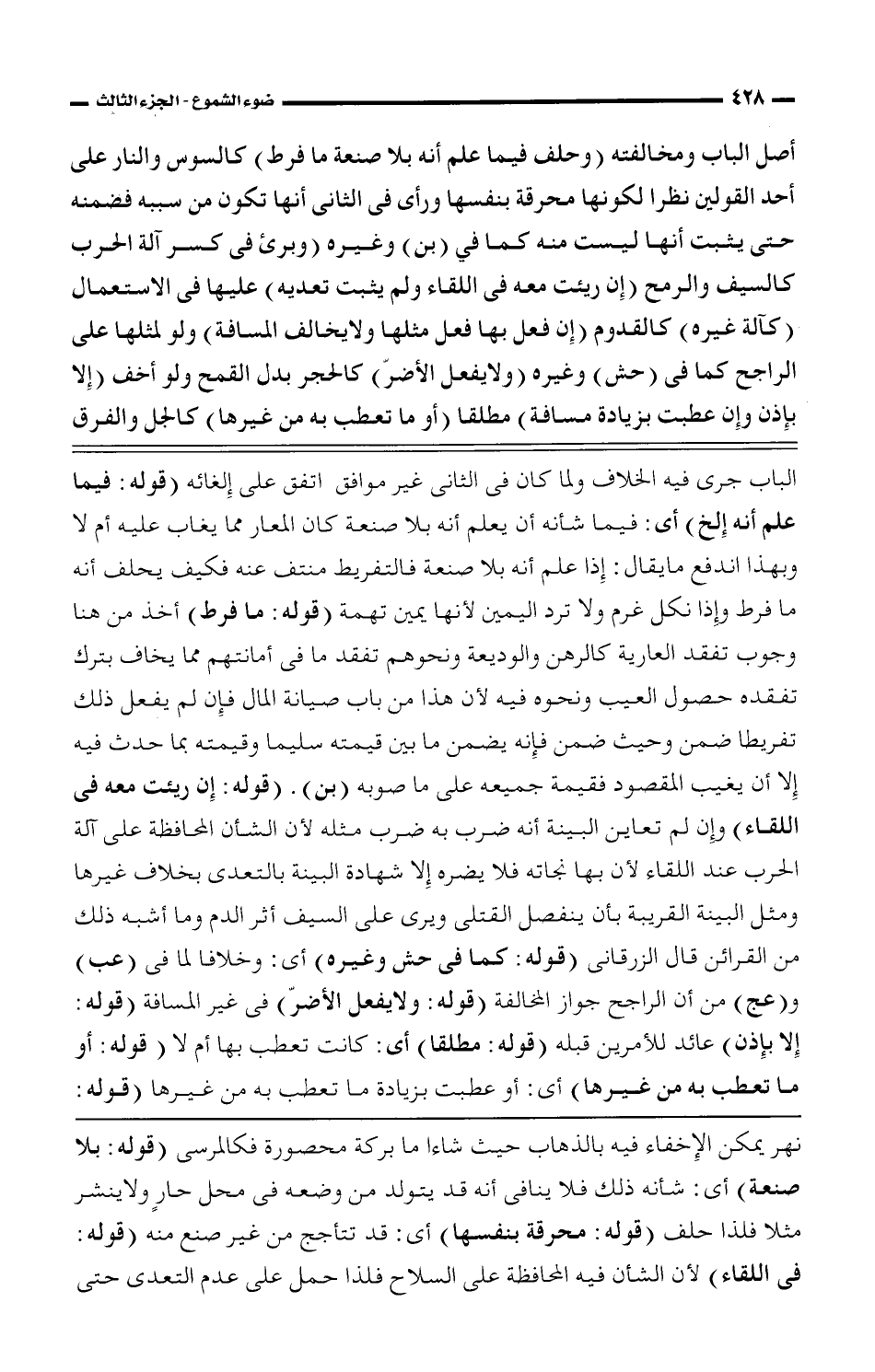 الباب جرى فيه الخلاف ولما كان فى الثانى غير موافق اتفق على إلغائه (قوله: فيما علم أنه إلخ) أى: فيما شأنه أن يعلم أنه بلا صنعة كان المعار مما يغاب عليه أم لا وبهذا اندفع ما يقال: إذا علم أنه بلا صنعة فالتفريط منتف عنه فكيف يحلف أنه ما فرط وإذا نكل غرم ولا ترد اليمين لأنها يمين تهمة (قوله: ما فرط) أخذ من هنا وجوب تفقد العارية كالرهن والوديعة ونحوهم تفقد ما فى أمانتهم مما يخاف بترك تفقده حصول العيب ونحوه فيه لأن هذا من باب صيانة المال فإن لم يفعل ذلك تفريطا ضمن وحيث ضمن فإنه يضمن ما بين قيمته سليما وقيمته بما حدث فيه إلا أن يغيب المقصود فقيمة جميعه على ما صوبه (بن). (قوله: إن رئيت معه فى اللقاء) وإن لم تعاين البينة أنه ضرب به ضرب مثله لأن الشأن المحافظة على آلة الحرب عند اللقاء لأن بها نجاته فلا يضره إلا شهادة البينة بالتعدى بخلاف غيرها ومثل البينة القريبة بأن ينفصل القتلى ويرى على السيف أثر الدم وما أشبه ذلك من القرائن قال الزرقانى (قوله: كما فى حش وغيره) أى: وخلافا لما فى (عب) و (عج) من أن الراجح جواز المخالفة (قوله: ولا يفعل الأضرّ) فى غير المسافة (قوله: إلا بإذن) عائد للأمرين قبله (قوله: مطلقا) أى: كانت تعطب بها أم لا (قوله: أو ما تعطب به من غيرها) أى: أو عطبت بزيادة ما تعطب به من غيرها (قوله: