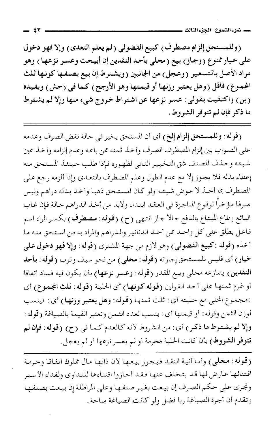 (وللمستحق إلزام مصطرف) كبيع الفضولى (لم يعلم التعدى) وإلا فهو دخول على خيار ممنوع (وجاز) بيع (محلى بأحد النقدين إن أبيحت وعسر نزعها) وهو مراد الأصل بالتسعير (وعجل) من الجانبين (ويشترط إن بيع بصنفه كونها ثلث المجموع) فأقل (وهل يعتبر وزنها أو قيمتها وهو الأرجح) كما فى (حش) ويفيده (بن) واكتفيت بقولى: عسر نزعها عن اشتراط خروج شئ منها وإلا لم يشترط ما ذكر فإن لم تتوفر الشروط.