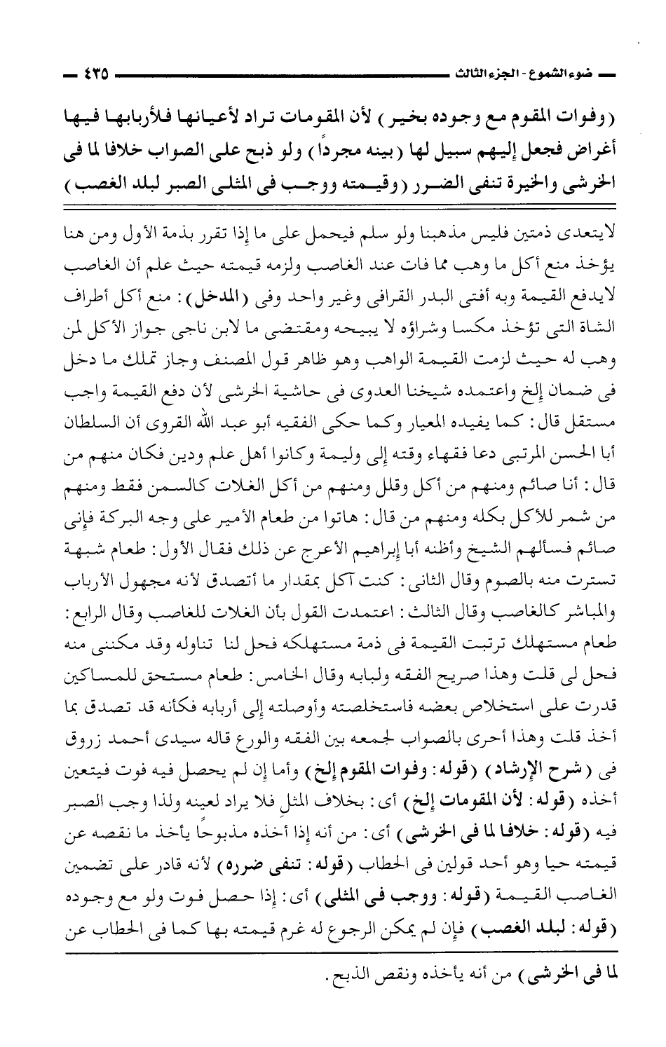 دعا فقهاء وقته إلى وليمة وكانواة أهل علم ودين فكان منهم من قال: أنا صائم ومنهم من أكل وقلل ومنهم من أكل الغلات كالسمن فقط ومنهم من شمر للأكل بكله ومنهم من قال: هاتوا من طعام الأمير على وجه البركة فإنى صائم فسألهم الشيخ وأظنه أبا إبراهيم الأعرج عن ذلك فقال الأول: طعام شبهة تسترت منه بالصوم وقال الثانى: كنت آكل بمقدار ما أتصدق لأنه مجهول الأرباب والمباشر كالغاصب وقال الثالث: اعتمدت القول بأن الغلات للغاصب وقال الرابع: طعام مستهلك ترتبت القيمة فى ذمة مستهلكه فحل لنا تناوله وقد مكننى منه فحل لى قلت وهذا صريح الفقه ولبابه وقال الخامس: طعام مستحق للمساكين قدرت على استخلاص بعضه فاستخلصته وأوصلته إلى أربابه فكانه قد تصدق بما أخذ قلت وهذا أحرى بالصواب لجمعه بين الفقه والورع قاله سيدى أحمد زروق فى (شرح الإرشاد) (قوله: وفوات المقوم إلخ) وأما إن لم يحصل فيه فوت فيتيعن أخذه (قوله: لأن المقومات إلخ) أى: بخلاف المثل فلا يراد لعينه ولذا وجب الصبر فيه (قوله: خلافا لما فى الخرشى) أى: من أنه إذا أخذه مذبوحًا يأخذ ما نقصه عن قيمته حيا وهو أحد قولين فى الحطاب (قوله: تنفى ضرره) لأنه قادر على تضيمن الغاصب القيمة (قوله: ووجب فى المثلى) أى: إذا حصل فوت ولو مع وجوده (قوله: لبلد الغصب) فإن لم يمكن الرجوع له غرم قيمته بها كما فى الحطاب عن