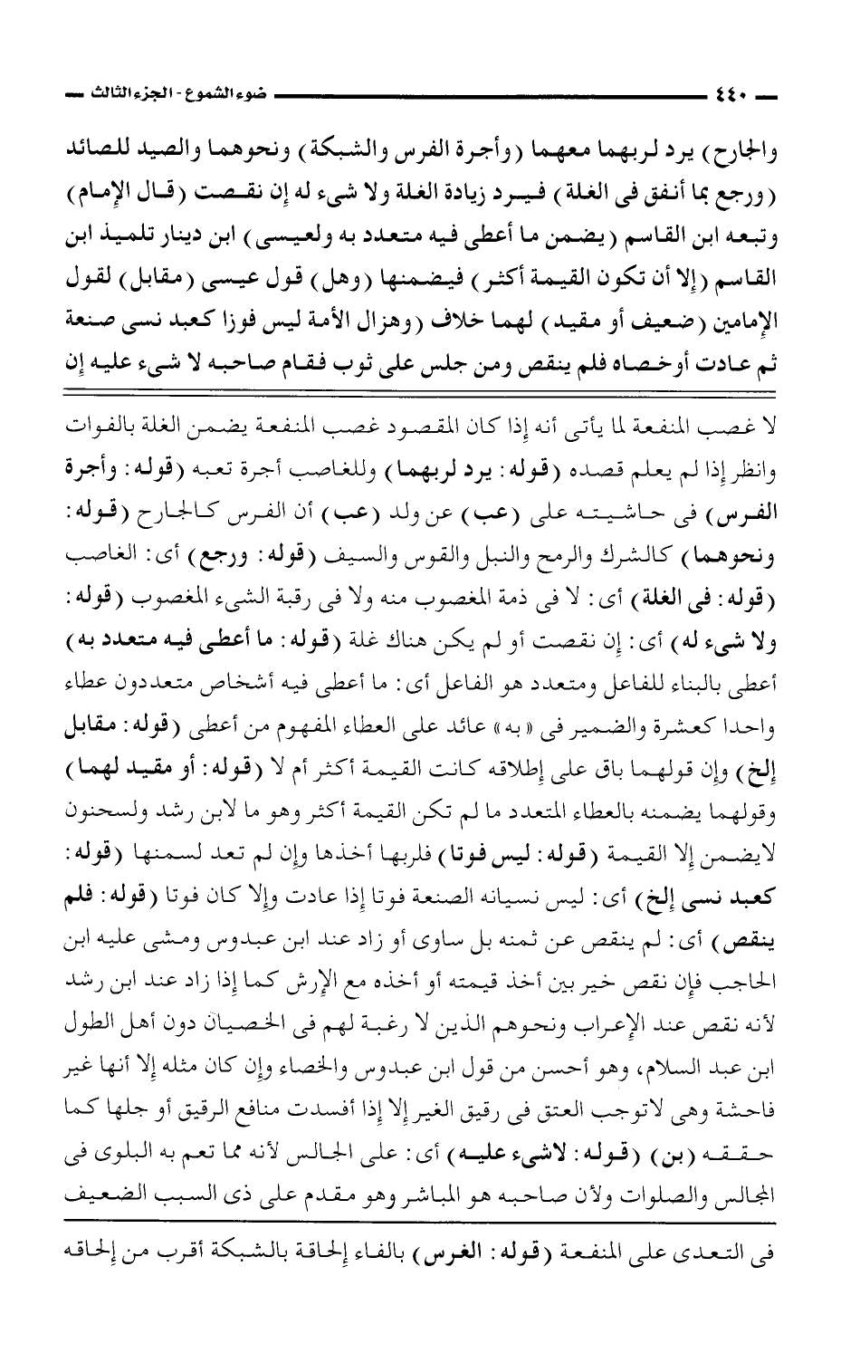 لا غصب المنفعة لما يأتى أنه إذا كان المقصود غصب المنفعة يضمن الغلة بالفوات وانظر إذا لم يعلم قصده (قوله: يرد لربهما) وللغاصب أجرة تعبه (قوله: وأجرة الفرس) فى حاشيته على (عب) عن ولد (عب) أن الفرس كالجارح (قوله: ونحوهما) كالشرك والرمح والنبل والقوس والسيف (قوله: ورجع) أى: الغاصب (قوله: فى الغلة) أى: لا فى ذمة المغصوب منه ولا فى رقبة الشئ المغصوب (قوله: ولا شئ له) أى: إن نقصت أو لم يكن هناك غلة (قوله: ما أعطى فيه متعدد به) أعطى بالبناء للفاعل ومتعدد هو الفاعل أى: ما أعطى فيه أشخاص متعددون عطاء واحدا كعشرة والضمير فى «به» عائد على العطاء المفهوم من أعطى (قوله: مقابل إلخ) وإن قولهما باق على إطلاقه كانت القيمة أكثر أم لا (قوله: أو مقيد لهما) وقولهما يضمنه بالعطاء المتعدد ما لم تكن القيمة أكثر وهو ما لابن رشد ولسحنون لا يضمن إلا القيمة (قوله: ليس فوتا) فلربها أخذها وإن لم تعد لسمنها (قوله: كعبد نسى إلخ) أى: ليس نسيانه الصنعة فوتا إذا عادت وإلا كان فوتا (قوله: فلم ينقص) أى: لم ينقص عن ثمنه بل ساوى أو زاد عند ابن عبدوس ومشى عليه ابن الحاجب فإن نقص خير بين أخذ قيمته أو أخذه مع الأرش كما إذا زاد عند ابن رشد لأنه نقص عند الإعراب ونحوهم الذين لا رغبة لهم فى الخصيان دون أهل الطول ابن عبد السلام, وهو أحسن من قول ابن عبدوس والخصاء وإن كان مثله إلا أنها غير فاحشة وهى لا توجب العتق فى رقيق الغير إلا إذا أفسدت منافع الرقيق أو جلها كما حققه (بن) (قوله: لا شئ عليه) أى: على الجالس لأنه مما تعم به البلوى فى المجالس والصلوات ولأن صاحبه هو المباشر وهو مقدم على ذى السبب