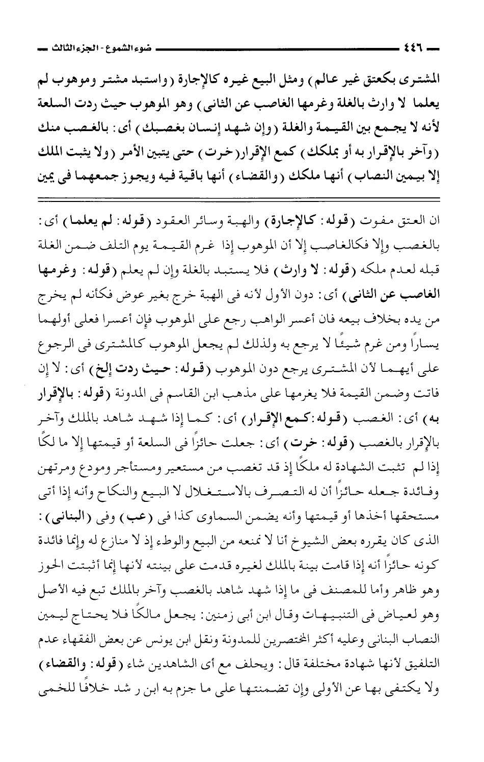 المشترى بكعتق غير عالم) ومثل البيع غيره كالإجارة (واستبد مشتر وموهوب لم يعلما لا وارث بالغلة وغرمها الغاصب عن الثانى) وهو الموهوب حيث ردت السلعة لأنه لا يجمع بين القيمة والغلة (وإن شهد غنسان بغصبك) أى: بالغصب منك (وآخر بالإقرار به أو بملكك) كمع الإقرار (خرت) حتى يتبين الأمر (ولا يثبت الملك إلا بيمين النصاب) أنها ملكك (والقضاء) أنه باقية فيه ويجوز جمعهما فى يمين