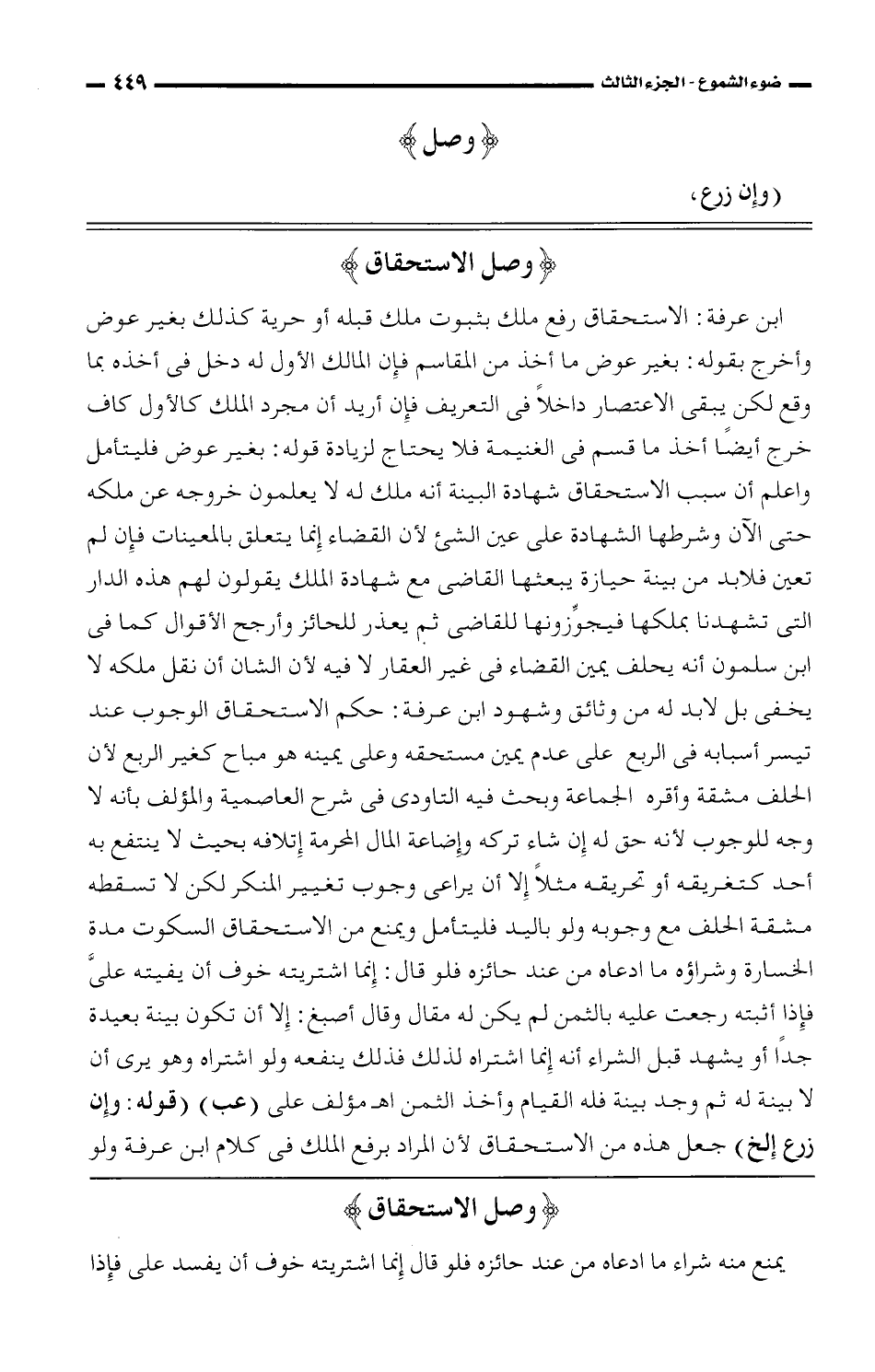 ابن عرفة: الاستحقاق رفع ملك بثبوت ملك قبله أو حرية كذلك بغير عوض وأخرج بقوله: بغير عوض ما أخذ من المقاسم فإن المالك الأول له دخل فى أخذه بما وقع لكن يبقى الاعتصار داخلًا فى التعريف فإن أريد أن مجرد الملك كالأول كاف خرج أيضًا أخذ ما قسم فى الغنيمة فلا يحتاج لزيادة قوله: بغير عوض فليتأمل واعلم أن سبب الاستحقاق شهادة البينة أنه ملك له لا يعلمون خروجه عن ملكه حتى الآن وشرطها الشهادة على عين الشئ لأن القضاء إنما يتعلق بالمعينات فإن لم تعين فلابد من بينة حيازة يبعثها القاضى مع شهادة الملك يقولون لهم هذه الدار التي تشهدنا بملكها فيجوزونها للقاضى ثم يعذر للحائز وأرجح الأقوال كما فى ابن سلمون أنه يحلف يمين القضاء فى غير العقار لا فيه لأن الشأن أن نقل ملكه لا يخفى بل لابد له من وثائق وشهود ابن عرفة: حكم الاستحقاق الوجوب عند تيسر أسبابه فى الربع على عدم يمين مستحقه وعلى يمينه هو مباح كغير الربع لأن الحلف مشقة وأقره الجماعة وبحث فيه التاودى فى شرح العاصمية والمؤلف بأنه لا وجه للوجوب لأنه حق له إن شاء تركه وإضاعة المال المحرمة إتلافه بحيث لا ينتفع به أحد كتغريقه أو تحريفه مثلًاإلا أن يراعى وجوب تغيير المنكر لكن لا تسقطه مشقة الحلف مع وجوبه ولو بالليد فليتأمل ويمنع من الاستحقاق السكوت مدة الخسارة وشراؤه ما ادعاه من عند حائزه فلو قال: إنما اشتريته خوف أن يفيته علىَّ فإذا أثبته رجعت عليه بالثمن لم يكن له مقال وقال أصبغ: إلا أن تكون بينة بعيدة جدًا أو يشهد قبل الشراء أنه إنما اشتراه لذلك فذلك ينفعه ولو اشتراه وهو يرى أن لا بينة له ثم وجد بينة فله القيام وأخذ الثمن اهـ مؤلف على (عب) (قوله: وإن زرع إلخ) جعل هذه من الاستحقاق لأن المراد برفع الملك فى كلام ابن عرفة ولو