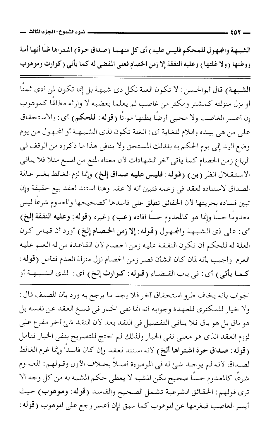 الشبهة) قال أبو الحسن: لا تكون الغلة لكل ذى شبهة بل إنما تكون لمن أدى ثمنًا أو نزل منزلته كمشتر ومكتر من غاصب لم يعلما بعضبه لا وارثه مطلقًا كموهوب إن أعسر الغاصب ولا محيى أرضًا يظنها مواتًا (قوله: للحكم) أى: بالاستحقاق على من هى بيده واللام للغاية أى: الغلة تكون لذى الشبهة أو المجهول من يوم وضع اليد إلى يوم الحكم به بلذلك المستحق ولا ينافى هذا ما ذكروه من الوقف فى الرباع زمن الخصام كما يأتى آخر الشهادات لأن معناه المنع من المبيع مثلا فلا ينافى الاستقلال انظر (بن) (قوله: فليس عليه صداق إلخ) وإنما لزم الغالط بغير عالمة الصداق لاستناده لعقد فى زعمه فتبين أنه لا عقد وهنا استند لعقد بيع حقيقة وإن تبين فساده بحريتها لأن الحقائق تطلق على فاسدها كصحيحها والمعدوم شرعًا ليس معدومًا حسًا وإنما هو كالمعدوم حسًا أفاده (عب) وغيره (قوله: وعليه النفقة إلخ) أى: على ذى الشبهة والمجهول (قوله: إلا زمن الخصام إلخ) أورد أن قياس كون الغلة له للحكم أن تكون النفقة عليه زمن الخصام لأن القاعدة من له الغنم عليه الغرم وأجيب بأنه لمان كان الشأن قصر زمن الخصام نزل منزلة العدم فتأمل (قوله: كما يأتى) أى: فى باب القضاء (قوله: كوارث إلخ) أى: لذى الشبهة أو