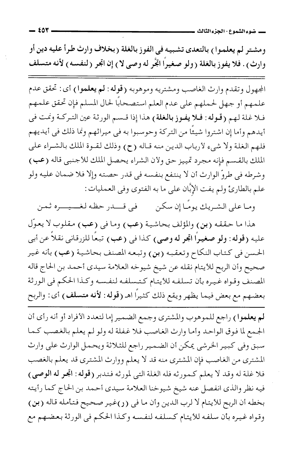 ومشتر لم يعلموا) بالتعدى تشبيه فى الفوز بالغة (بخلاف وارث طرأ عليه دين أو وارث). فلا يفوز بالغلة (ولو صغيرًا اتجَّر له وصى لا) إن اتجر (لنفسه) لأنه متسلف