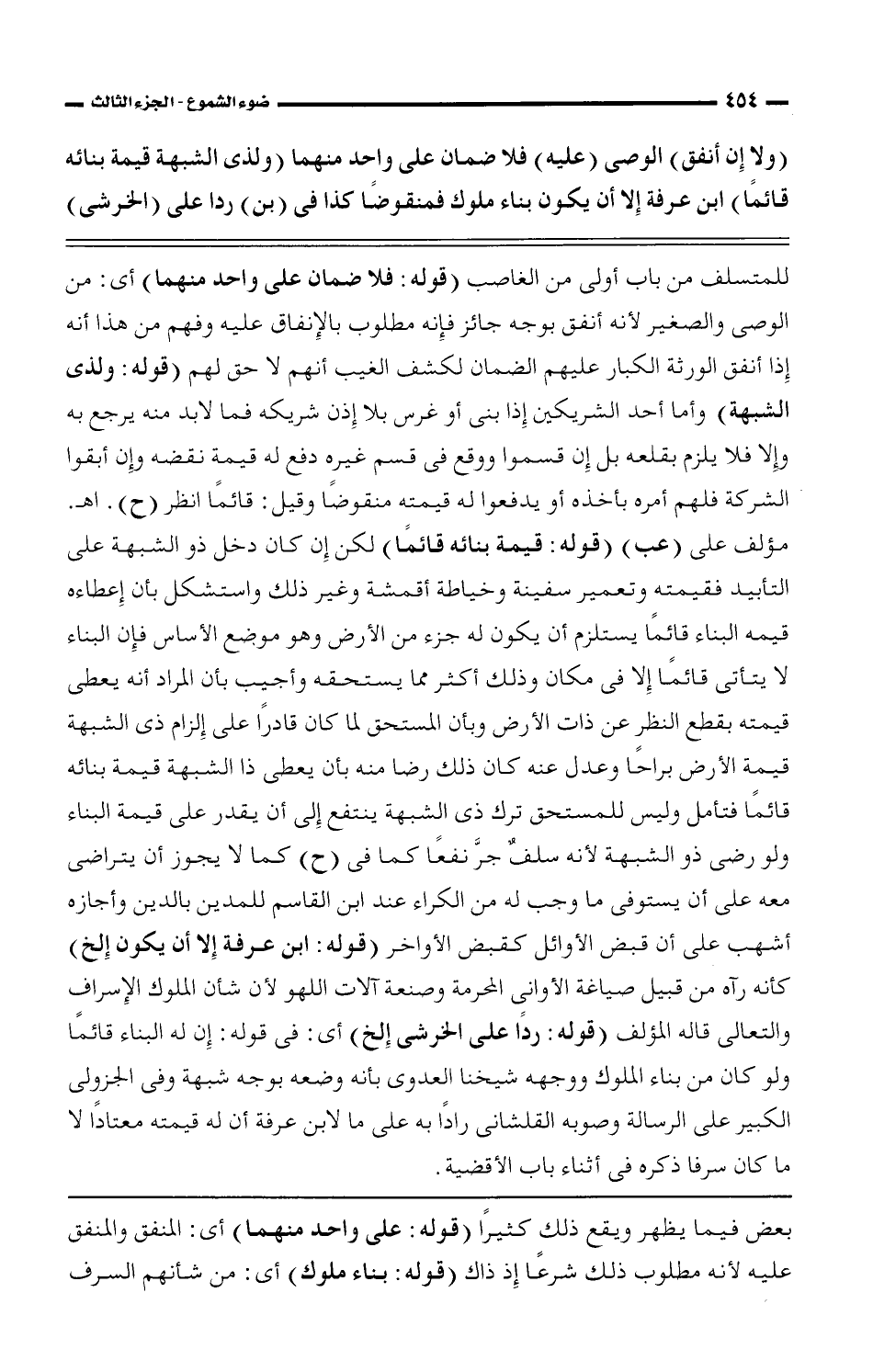للمتسلف من باب أولى من الغاصب (قوله: فلا ضمان على واحد منهما) أى: من الوصى والصغير لأنه أنفق بوجه جائز فإنه مطلوب بالإنفاق عليه وفهم من هذا أنه إذا أنفق الورثة الكبار عليهم الضمان لكشف الغيب أنهم لا حق لهم (قوله: ولذى الشبهة) وأما أحد الشريكين إذا بنى أو غرس بلا إذن شريكه فما لابد منه يرجع به وإلا فلا يلزم بقلعه بلا إن قسموا ووقع فى قسم غيره دفع له قيمة نقضه وإن أبقوا الشركة فلهم أمره بأخذه أو يدفعوا له قيمته منقوضًا وقيل: قائمًا انظر (ح). اهـ. مؤلف على (عب) (قوله: قيمة بنائه قائمًا) لكن إن كان دخل ذو الشبهة على التأبيد فقيمته وتعمير سفينه وخياطة أقمشة وغير ذلك واستشكل بأن إعطاءه قيمة البناء قائمًا يستلزم أن يكون له جزء من الأرض وهو موضع الأساس فإن البناء لا يتأتى قائمًا إلا فى مكان وذلك أكثر مما يستحقه وأجيب بأن المراد أنه يعطى قيمته بقطع النظر عن ذات الأرض وبأن المستحق لما كان قادرًا على إلزام ذى الشبهة قيمة الأرض براحًا وعدل عنه كان ذلك رضا منه بأن يعطى ذا الشبهة قيمة بنائه قائمًا فتأمل وليس للمستحق ترك ذى الشبهة ينتفع إلى أن يقدر على قيمة البناء ولو رضى ذو الشبهة لأنه سلفٌ جرَّ نفعًا كما فى (ح) كما لا يجوز أن يتراضى معه على أن يستوفى ما وجب له من الكراء عند ابن القاسم للمدين بالدين وأجازه أشهب على أن قبض الأوائل كقبض الأواخر (قوله: ابن عرفة إلا أن يكون إلخ) كأنه رآه من قبيل صياغة الأوانى المحرمة وصنعة آلات اللهو لأن شأن الملوك الإسراف والتعالى قاله المؤلف (قوله: ردًا على الخرشى إلخ) أى: وضعه بوجه شبهة وفى الجزولى الكبير على الرسالة وصوبه القلشانى رادًا به على ما لابن عرفة أن له قيمته معتادًا لا ما كان سرفا ذكره فىأثناء باب الأقضية.