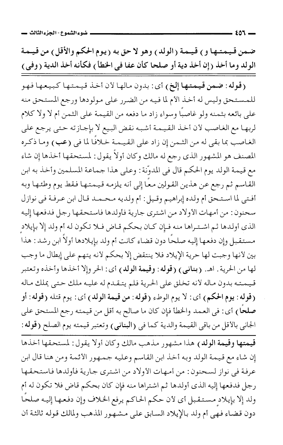 قيمتها وقيمة الولد) هذا مشهور مذهب مالك وكان أولا يقول: لمستحقها أخذها إن شاء مع قيمة الولد وبه أخذ ابن القاسم وعليه جمهور الأئمة ومن هنا قال ابن عرفة فى نواز لسحنون: من أمهات الأولاد من اشترى جارية فأولدها فاستحقها رجل فدفعها إليه الذى أولدها ثم اشتراها منه فإن كان بحكم قاض فلا تكون له أم ولد إلا بإيلاد مستقبل أى لأن حكم الحاكم يرفع الخلاف وإن دفعها إليه صلحًا دون قضاء فهى أم ولد بالإيلاد السابق على مشهور المذهب ولمالك قوله ثالثة أن