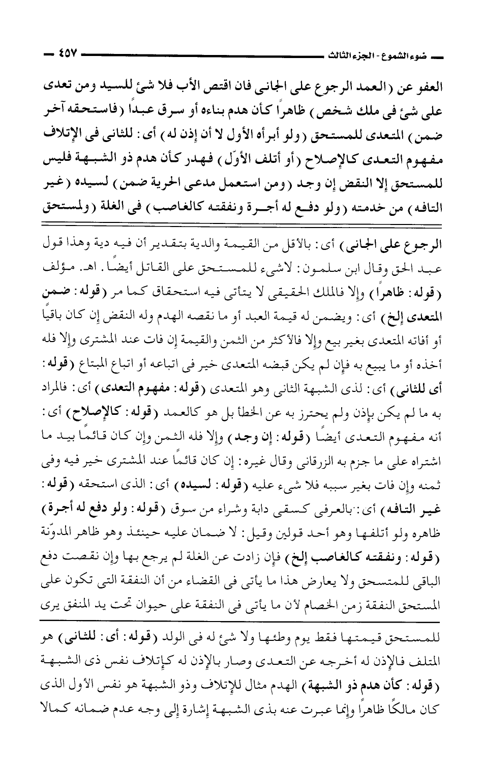 العفو عن (العمد الرجوع على الجانى فان اقتص الأب فلا شئ للسيد ومن تعدى على شئ فى ملك شخص) ظاهرًا كأن هدم بناءه أو سرق عبدًا (فاستحقه آخر ضمن) المتعدى للمستحق (ولو أبرأه الأول لا أن إذن له) أى: للثانى فى الإتلاف مفهوم التعدى كالإصلاح (أو أتلف الأوّل) فهدر كأن هدم ذو الشبهة فليس للمستحق إلا النقض إن وجد (ومن استعمل مدعى الحرية ضمن) لسيده (غير االتافه) من خدمته (ولو دفع له أجرة ونفقته كالغاصب) فى الغلة (ولمستحق