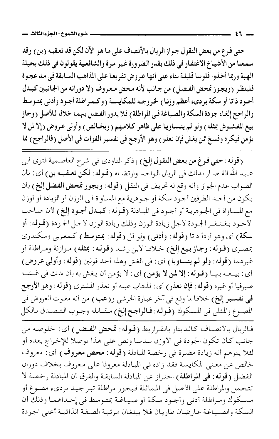 فالريال بالأنصاف كالدينار بالقراريط (قوله: تمحض الفضل) أى: خلوصه من جانب كأن تكون الجودة فى الأوزن سدسا ونص على هذا توصلا للإخراج بعده أو لئلا يتوهم أنه زيادة مضرة فى رخصة المبادلة (قوله: محض معروف) أى: معروف خالص عن معنى المكايسة فقد زاده فى المبادلة معروفا على معروف بخلاف دوران الفضل (قوله: فى المراطلة) احتراز عن المبادلة السابقة والفرق أن المبادلة رخصة لا تتحمل والمراطلة على الأصل فى المماثلة فيجوز مراطلة تبر جيد بردئ مصوغ أو مسكوك ومراطلة أدنى وأجود سكة أو صياغة بمتوسط فى إحداهما وذلك أن السكة والصياغة عارضان طاريان فلا يبلغان مرتبة الصفة الذاتية أعنى الجودة