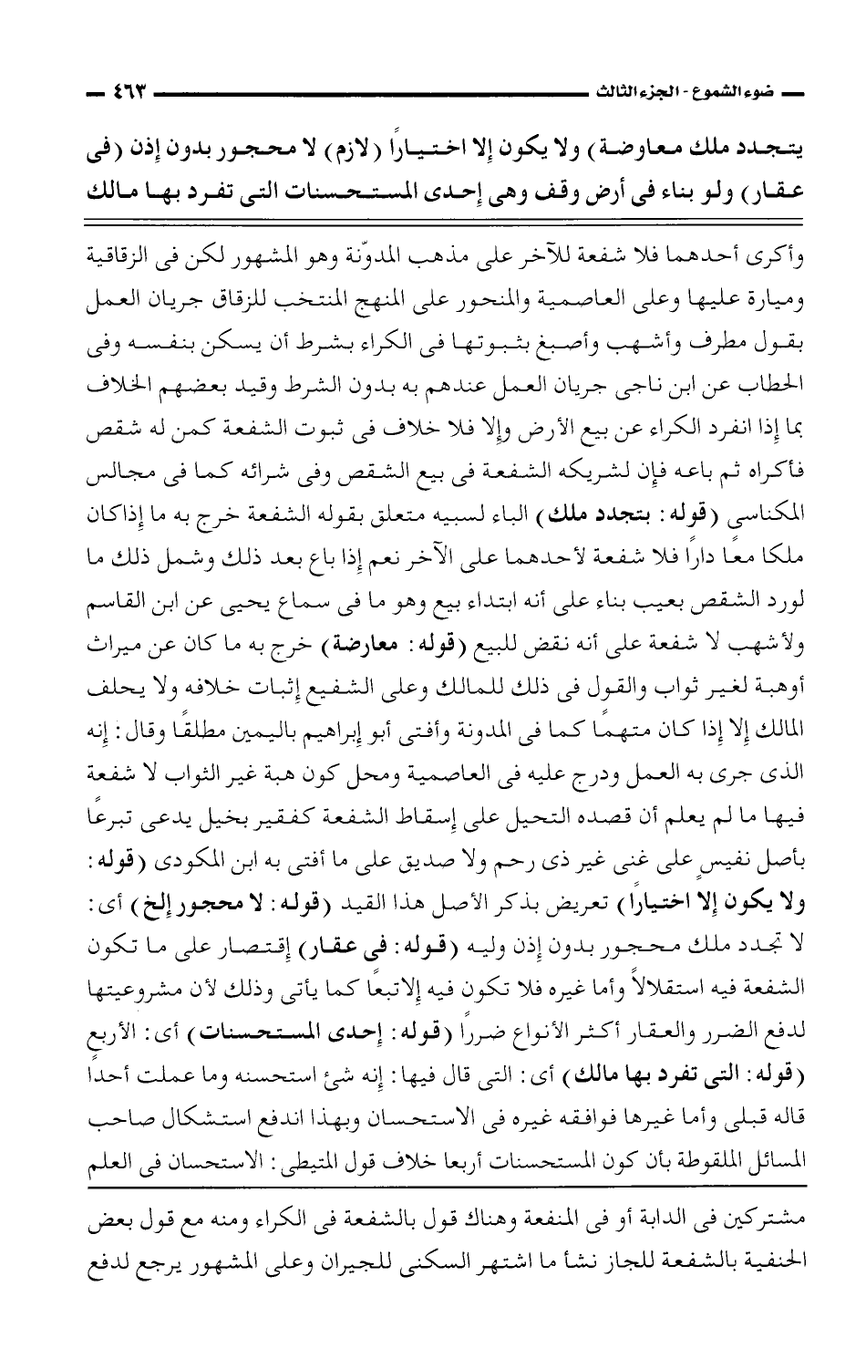 وأكرى أحدهما فلا شفعة للآخر على مذهب المدوّنة وهو المشهور لكن فى الزقاقية وميارة عليها وعلى العاصمية والمنحور على المنهج المنتخث للزقاق جريان العمل بقول مطرف وأشهب وأصبغ بثبوتها فى الكراء بشرط أن يسكن بنفسه وفى الحطاب عن ابن ناجى جريان العمل عندهم به بدون الشرط وقيد بعضهم الخلاف بما إذا انفرد الكراء عن بيع الأرض وإلا فلا خلاف فى ثبوت الشفعة كمن له شقص فأكراه ثم باعه فإن لشريكه الشفعة فى بيع الشقص وفى شرائه كما فى مجالس المكناسى (قوله: بتجدد ملك) الباء لسبيه متعلق بقوله الشفعة خرج به ما إذا كان ملكا معصًا دارًا فلا شفعا لأحدهما على الآخر نعم إذا باع بعد ذلك وشمل ذلك ما لورد الشقص بعيب بناء على أنه ابتداء بيع وهو ما فى سماع يحيى عن ابن القاسم ولأشهب لا شفعة على أنه نقض للبيع (قوله: معارضة) خرج به ما كان عن ميراث أوهبة لغير ثواب والقول فى ذلك للمالك وعلى الشفيع إثبات خلافه ولا يحلف المالك إلا إذا كان متهمًا كما فى المدونة وأفتى أبو إبراهيم باليمين مطلقًا وقال: إنه الذى جرى به العمل ودرج عليه فى العاصمية ومحل كون هبة غير الثواب لا شفعة فيها ما لم يعلم أن قصده التحيل على إسقاط الشفعة كفقير بخيل يدعى تبرعًا بأصل نفيسٍ على غنى غير ذى رحم ولا صديق على ما أفتى به ابن المكودى (قوله: ولا يكون إلا اختبارًا) تعريض بذكر الأصل هذا القيد (قوله: لا محجور إلخ) أى: لا تجدد ملك محجور بدون إذن وليه (قوله: فى عقار) إقتصار على ما تكون الشفعة فيه استقلالًا وأما غيره فلا تكون فيه إلا تبعًا كما يأتى وذلك لأن مشروعيتها لدفع الضرر والعقار أكثر الأنواع ضررًا (قوله: إحدى المستحسنات) أى: الأربع (قوله: التى تفرد بها مالك) أى: التى قال فيها: إنه شئ استحسنه وما عملت أحدًا قاله قبلى وأما غيرها فوافقه غيره فى الاستحسان وبهذا اندفع استشكال صاحب المسائل الملقوطة بأن كون المستحسنات أربعا خلاف قول المتيطى: الاستحسان فى العلم