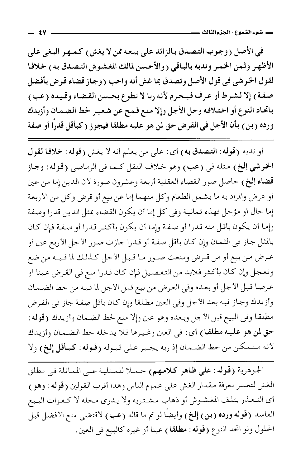 الجوهرية (قوله: على ظاهر كلامهم) حملا للمثلية على المماثلة فى مطلق الغش لتعسر معرفة مقدار الغش على عموم الناس وهذا أقرب القولين (قوله: وهو) أى التعذر بتلف المغشوش أو ذهاب مشتريه ولا يدرى محله لا كفوات البيع الفاسد (قوله ورده (بن) إلخ) وأيضًا لو تم ما قاله (عب) لاقتضى منع الأفضل قبل الحلول ولو اتحد النوع (قوله: مطلقا) عينا أو غيره كالبيع فى العين.