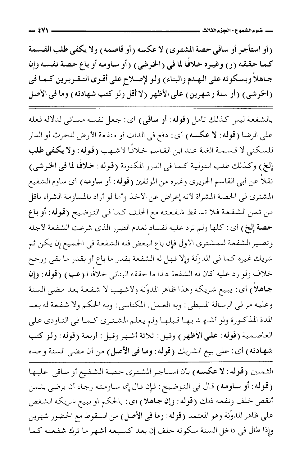 بالشفعة ليس كذلك تأمل (قوله: أو ساقى) أى: جعل نفسه مساقى لدلالة فعله على الرضا (قوله: لا عكسه) أى: دفع فى الذات أو منفعة الأرض للحرث أو الدار للسكنى لا قسمة الغلة عند ابن القاسم خلافًا لأشهب (قوله: ولا يكفى طلب إلخ) وكذلك طلب التولية كما فى الدرر المكنونة (قوله: أو ساومه) أى ساوم الشفيع المشترى فى الحصة المشراة لأنه إعراض عن الأخذ وأما لو أراد بالمساومة الشراء بأقل من ثمن الشفعة فلا تسقط شفعته مع الحلف كما فى التوضيح (قوله: أو باع حصة إلخ) أى: كلها ولم ترد عليه لفساد لعدم الضرر الذى شرعت الشفعة لأجله وتصير الشفعة للمشترى الأول فإن باع البعض فله الشفعة فى الجميع إن يكن ثم شريك غيره كما فى المدوّنة وإلا فهل له الشفعة بقدر ما باع أو بقدر ما بقى ورجح خلاف ولو رد عليه كان له الشفعة هذا ما حققه البنانى خلافًا لـ (عب) (قوله: وإن جاهلًا) أى: يبيع شريكه وهذا ظاهر المدوّنة ولأشهب لا شفعة بعد مضى السنة وعليه مر فى الرسالة المتيطى: وبه العمل. المكناسى: وبه الحكم ولا شفعة له بعد المدة المذكورة ولو أشهد بها قبلها ولم يعلم المشترى كما فى التاودى على العاصمية (قوله: على الأظهر) وقيل: ثلاثة أشهر وقيل: أربعة (قوله: ولو كتب شهادته) أى: على بيع الشريك (قوله: وما فى الأصل) من أن مضى السنة وحده