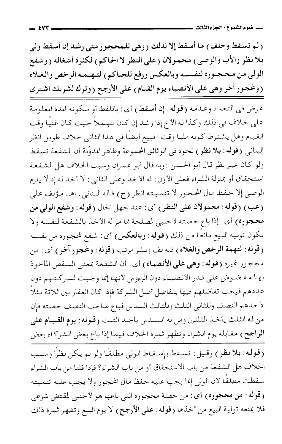 غرض فى التعتدد وعدمه (قوله: إن أسقط) أى: باللفظ أو سكوته المدة المعلومة على خلاف فى ذلك وكذا له الأخ إذا رشد إن كان مهملًا حيث كان غنيًا وقت القيام وهل يشترط كونه مليا وقت البيع أيضًا فى هذا الثانى خلاف طويل انظر البنانى (قوله: بلا نظر) نحوه فى الوثائق المجموعة وظاهر المدوّنة أن الشفعة تسقط ولو كان غير نظر قال أبو الحسن: وبه قال أبو عمران وسبب الخلاف هل الشفعة استحقاق أو بمنزلة الشراء فعلى الأول: له الأخذ وعلى الثانى: لا أخذ له إذ لا يلزم الوصى إلا حفظ مال المحجور لا تنميته انظر (ح) قال البنانى. اهـ. مؤلف على (عب) (قوله: محمولان على النظر) أى: عند جهل الحال (قوله: وشفع الولى من محجوره) أى: إذا باع حصته لأجنبى لمصلحة مما مر له الأخذ بالشفعة لنفسه ولا يكون توليه البيع مانعًا من ذلك (قوله: وبالعكس) أى: شفع لمحجوره من نفسه (قوله: لتهمة الرخص والغلاء) فيه لف ونشر مرتب (قوله: ولمحجور آخر) أى: من محجور غيره (قوله: وهى على الأنصباء) أى: أن الشفعة بمعنى الشقص المأخوذ بها مفضوض على قدر الأنصباء دون الرءوس لأنها إنما وجبت لشركتهم دون عددهم فيجب تفاضلهم فيها بتفاضل أصل الشركة فإذا كان العقار بين ثلاثة مثلًا لأحدهم النصف وللثانى الثلث وللثالث السدس فباع صاحب النصف حصته فإن من له الثلث يأخذ الثلثين ومن له السدس يأخذ الثلث (قوله: يوم القيام على الراجح) مقابله يوم الشراء تظهر ثمرة الخلاف فيما إذا باع بعض الشركاء بعض