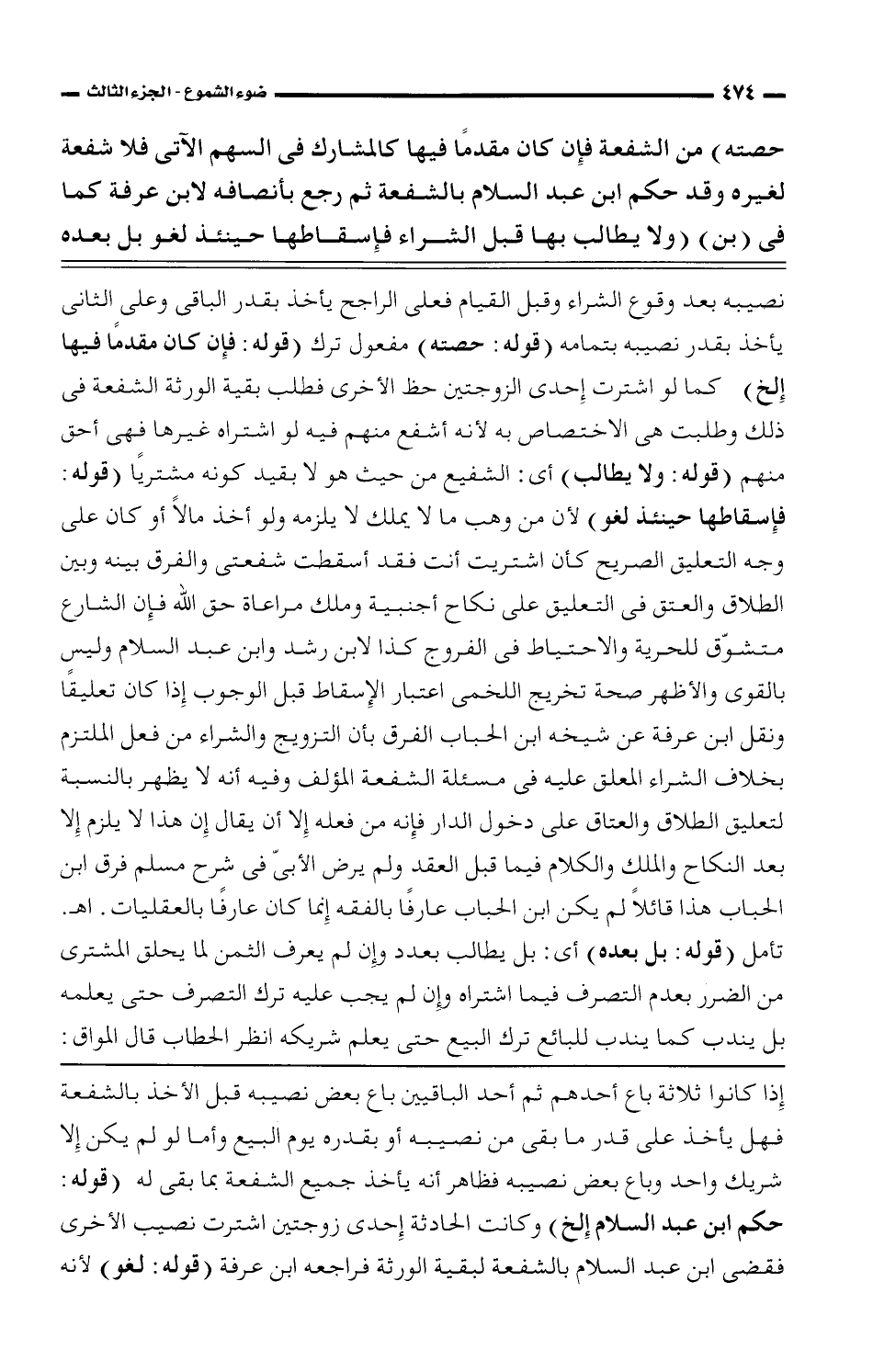 حصته) من الشفعة فإن كان مقدمًا فيها كالمشارك فى السهم الآتى فلا شفعة لغيره وقد حكم ابن عبد السلام بالشفعة ثم رجع بأنصافه لابن عرفة كما فى (بن) (ولا يطالب بها قبل الشراء فإسئقاطها حينئذ لغو بل بعده