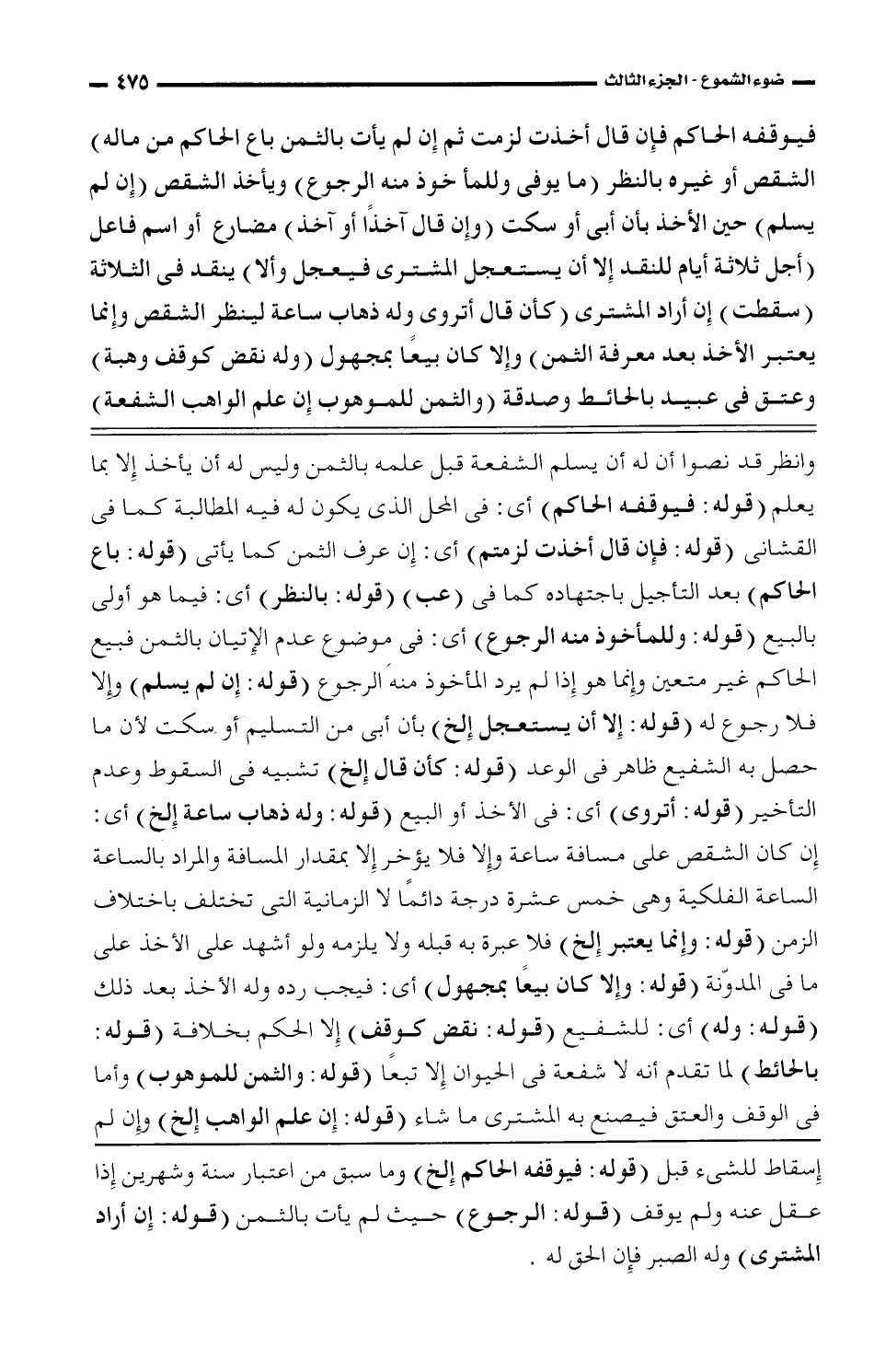 فيوقفه الحاكم فإن قال أخذت لزمت ثم إن لم يأت بالثمن باع الحاكم من ماله) الشقص أو غيره بالنظر (ما يوفى وللمأ خوذ منه الرجوع) ويأخذ الشقص (إن لم يسلم) حين الأخذ بأن أبى أوسكت (وإن قال آخذًا أو آخذ) مضارع أو اسم فاعل (أجل ثلاثة أيام للنقد إلا أن يستعجل المشترى فيعجل وألا) ينقد فى الثلاثة (سقطت) إن أراد المشترى (كأن قال أتروى وله ذهاب ساعة لينظر الشقص وإنما يعتبر الأخذ بعد معرفة الثمن) وإلا كان بيعًا بمجهول (وله نقض كوقف وهبة) وعتق فى عبيد بالحائط وصدقة (والثمن للموهوب إن علم الواهب الشفعة)