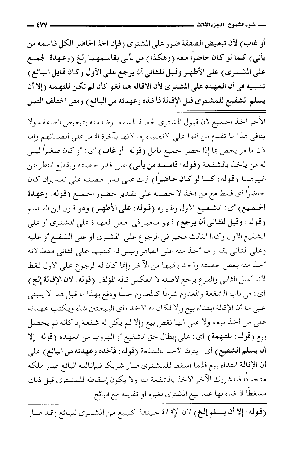 الآخر أخذ الجميع لأن قبول المشترى لحصة المسقط رضا منه بتبعيض الصفقة ولا ينافى هذا ما تقدم من أنها على الأنصباء إما لأنها بآخرة الأمر على أنصبائهم وإما لأن ما مر يخص بما إذا حضر الجميع تأمل (قوله: أو غاب) أى: أو كان صغيرًا ليس له من يأخذ بالشفعة (قوله: قاسمه من يأتى) على قدر حصته ويقطع النظر عن غيرهما (قوله: كما لو كان حاضرًا) أيك على قدر حصته على تقديران كان حاضرًا أى فقط مع من أخذ لا حصته على تقدير حضر الجميع (قوله: وعهدة الجميع) أى: الشفيع الأول وغيره (قوله: على الأظهر) وهو قول ابن القاسم (قوله: وقيل للثانى أن يرجع) فهو مخير فى جعل العهدة على المشترى أو على الشفيع الأول وكذا الثالث مخير فى الرجوع على المشترى أو على الشفيع أو عليه وعلى الثانى بقدر ما أخذ منه على الظاهر وليس له كتبها على الثانى فقط لأنه أخذ منه بعض حصته وأخذ باقيها من الآخر وإنما كان له الرجوع على الأول فقط لأنه أصل الثانى والفرع يرجع لأصله لا العكس قاله المؤلف (قوله: لأن الإقالة إلخ) أى: فى باب الشفعة والمعدوم شرعًا كالمعدوم حسًا ودفع بهذا ما قيل هذا لا ينبنى على ما أن الإقالة ابتداء بيع وإلا لكان له الأخذ بأى البيعتين شاء ويكتب عهدته على من أخذ بيعه ولا على أنها نقض بيع وإلا لم يكن له شفعة إذ كأنه لم يحصل بيع (قوله: للتهمة) أى: على إبطال حق الشفيع أو الهروب من العهدة (قوله: إلا أن يسلم الشفيع) أى: يترك الأخذ بالشفعة (قوله: فأخذه وعهدته من البائع) على أن الإقالة ابتداء بيع فلما أسقط للمشترى صار شريكًا فبإقالته البائع صار ملكه متجددًا فللشريك الآخر الأخذ بالشفعة منه ولا يكون إسقاطه للمشترى قبل ذلك مسقطًا لأخذه لها عند بيع المشترى لغيره أو تقايله مع البائع.