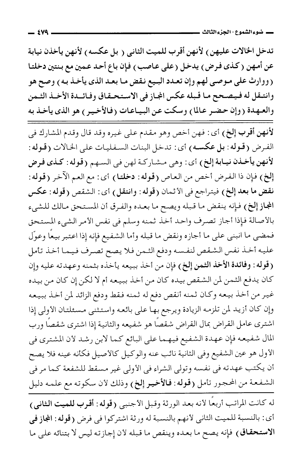 تدخال الخالات عليهن) لأنهن أقرب للميت الثانى (بل عكسه) لأنهن يأخذن نيابة عن أمهن (كذى فرض) يدخل (على عاصب) فإن باع أحد عمين مع بنتين دخلتا (ووارث على موصى لهم وإن تعدد البيع نقض ما بعد الذى يأخذ به) وصح هو وانتقل له فيصحح ما قبله عكس المجاز فى الاستحقاق وفائدة الأخذ الثمن والعهدة (وإن حضر عالما) وسكت عن البياعات (فالأخير) هو الذى يأخذ به