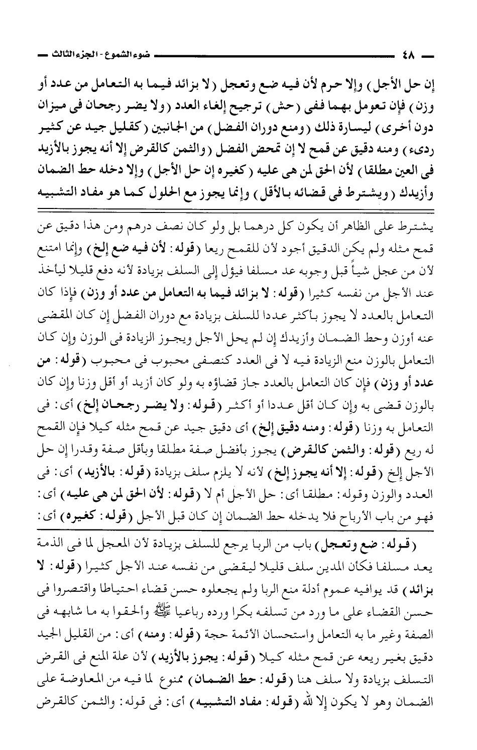 إن حل الأجل) وإلا حرم لأن فيه ضع وتعجل (لا بزائد فيما به التعامل من عدد أو وزن) فإن تعومل بهما ففى (حش) ترجيح إلغاء العدد (ولا يضر رجحان فى ميزان دون أخرى) ليسارة ذلك (ومنع دوران الفضل) من الجانبين (كقليل جيد عن كثير ردئ) ومنه دقيق عن قمح لا إن تمحض الفضل (والثمن كالقرض إلا أنه يجوز بالأزيد فى العين مطلقا) لأن الحق لمن هو عليه (كغيره إن حل الأجل) وإلا دخله حط الضمان وأزيدك (ويشترط فى قضائه بالأقل) وإنما يجوز مع الحلول كما هو مفاد التشبيه