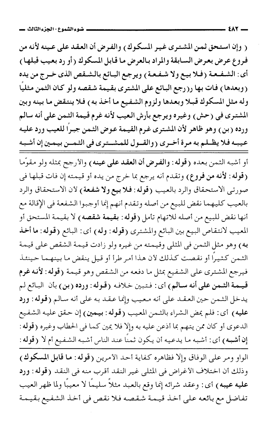(وإن استحق ثمن المشترى غير المسكوك) والفرض أن العقد على عينه لأنه من فرع عرض بعرض السابقة والمراد بالعرض ما قابل المسكوك (أو رد بعيب قبلها) أى: الشفعة (لإلا بيع ولا شفعة) ويرجع البائع بالشقص الذى خرج من يده (وبعدها) فات بها ر (رجع البائع على المشترى بقيمة شقصه ولو كان الثمن مثليًا وله مثل المسكوك قبلا وبعدها ولزوم الشفيع ما أخذ به) فلا ينتقض ما بينه وبين المشترى فى (حش) وغيره ويرجع بأرش العيب لأنه غرم قيمة الثمن على أنه سالم ورده (بن) وهو ظاهر لأن المشترى غرم القيمة عوض الثمن جبرًا للعيب ورد عليه عيبه فلا يظلم به مرة أخرى (والقول للمشترى فى الثمن بيمين إن أشبه