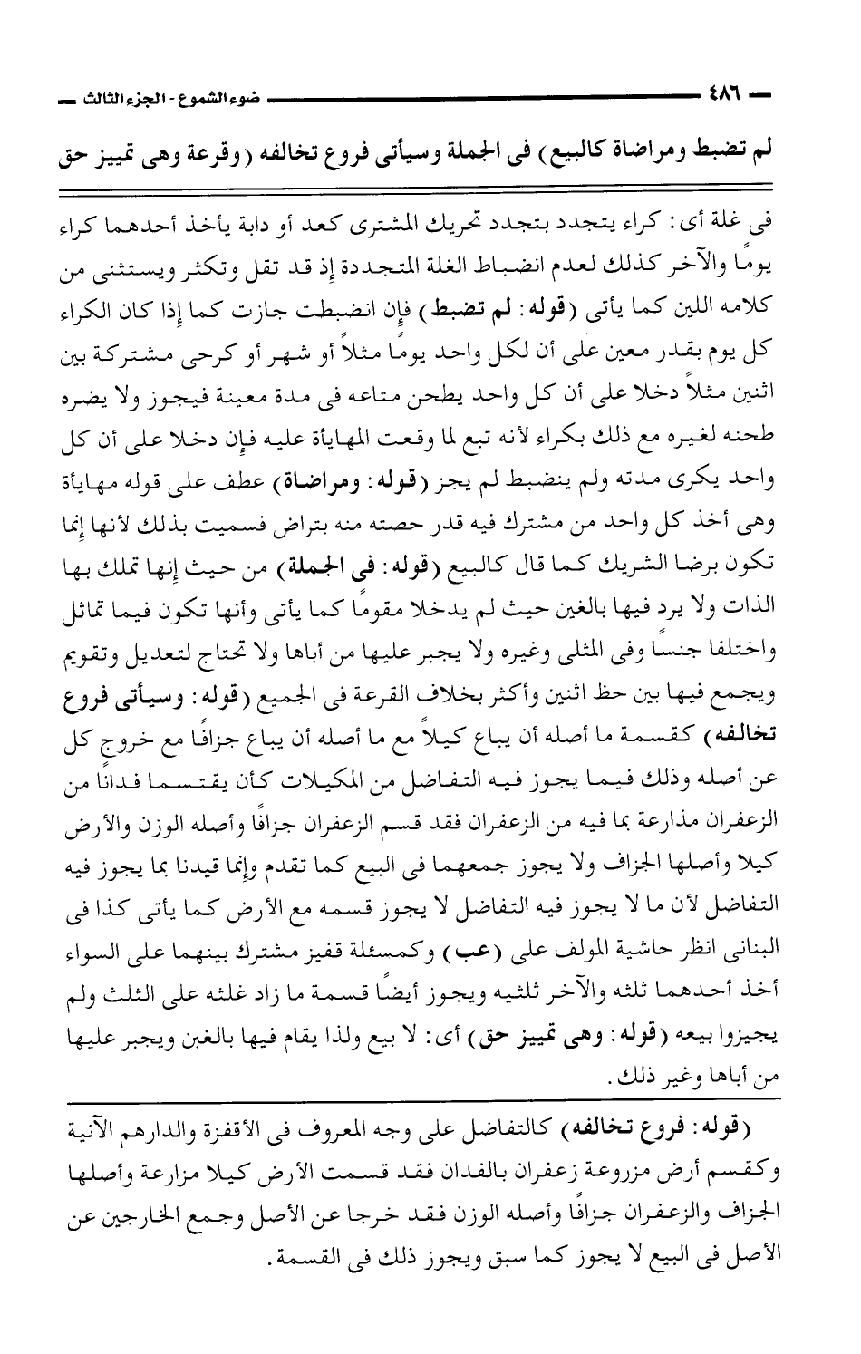 (وقوله: فروع تخالفه) كالتفاضل على وجه المعروف فى الأقفزة والدارهم الآنية وكقسم أرض مزروعة زعفران بالفدان فقد قسمت الأرض كيلا مزارعة وأصلها الجزاف والزعفران جزافًا وأصله الوزن فقد خرجا عن الأصل وجمع الخارجين عن الأصل فى البيع لا يجوز كما سبق ويجوز ذلك فى القسمة.